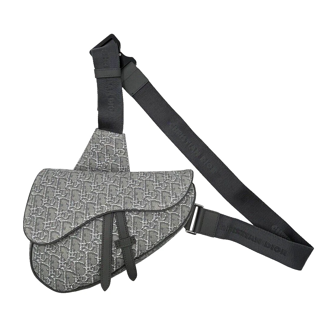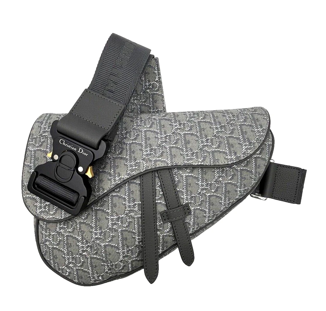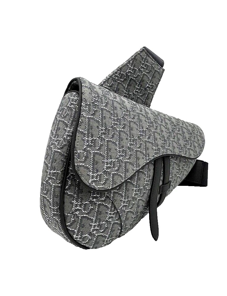 A brand new Dior Saddle Bag, crafted from signature jacquard canvas featuring the iconic Dior Oblique motif in a refined grey colourway. The instantly recognisable asymmetric silhouette is complemented by tonal leather trim and strap detailing, delivering a perfect balance of heritage design and contemporary appeal. The curved flap and structured form highlight one of Dior’s most celebrated and enduring designs.