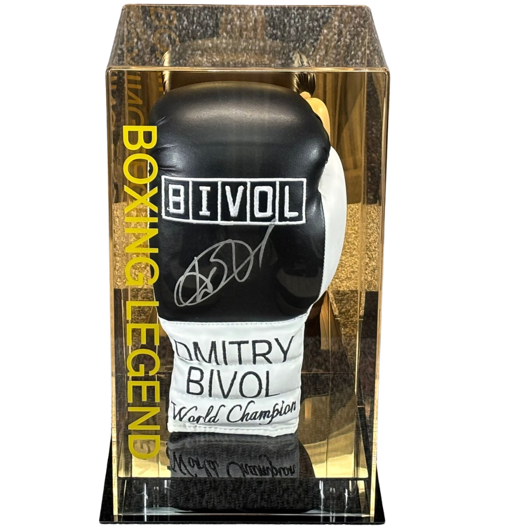 The elegant black glove prominently features Dmitry Bivol’s signature, along with his name and "World Champion" lettering, symbolizing his dominance in the light heavyweight division. The sophisticated design is complemented by the "Boxing Legend" inscription in gold on the display case, adding an element of prestige to this unique item.
