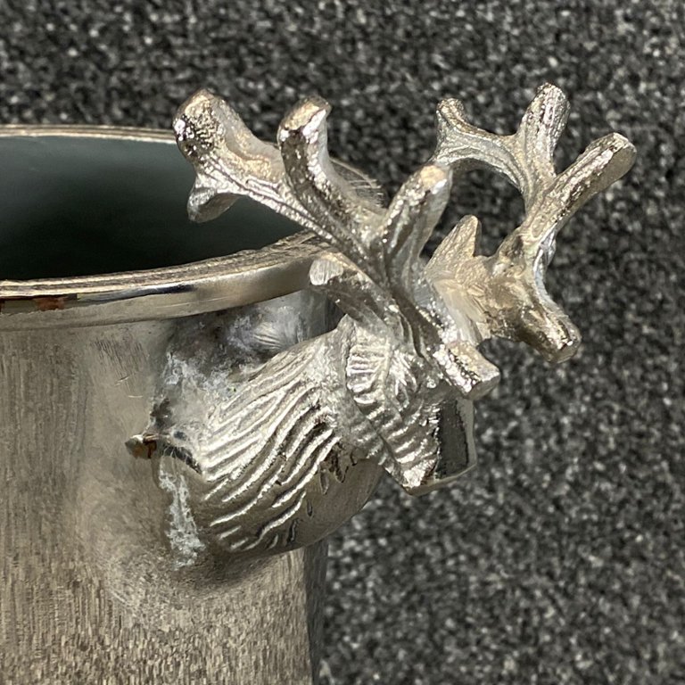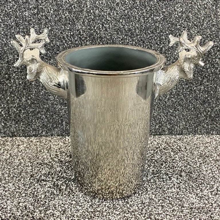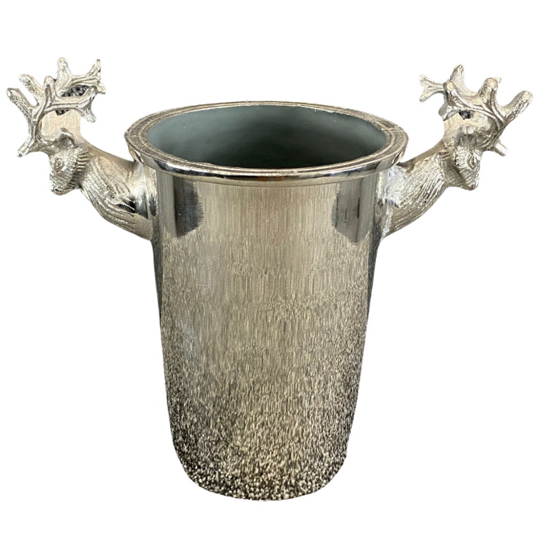 A chrome double stag handle design champagne bucket stands approximately 10 inches tall with a width of 11 inches. This exquisite champagne bucket features a unique double stag handle design that adds a touch of elegance and sophistication to any occasion.