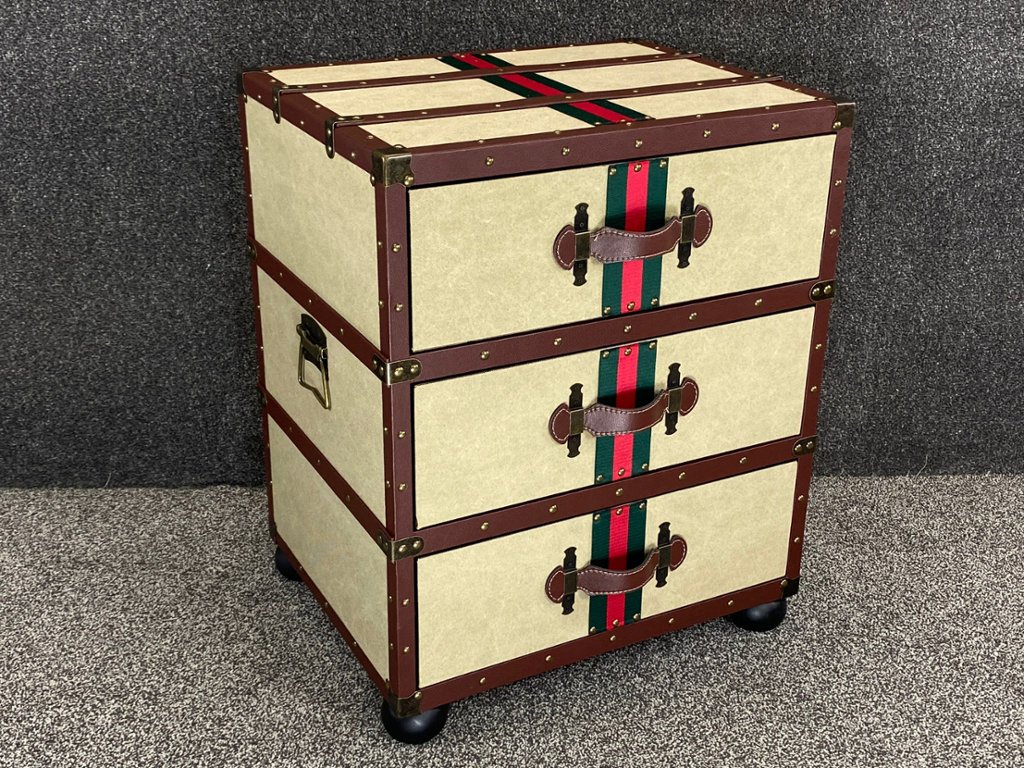 A handbuilt fabric and leather three drawer side table complete with copper handles and clasps.