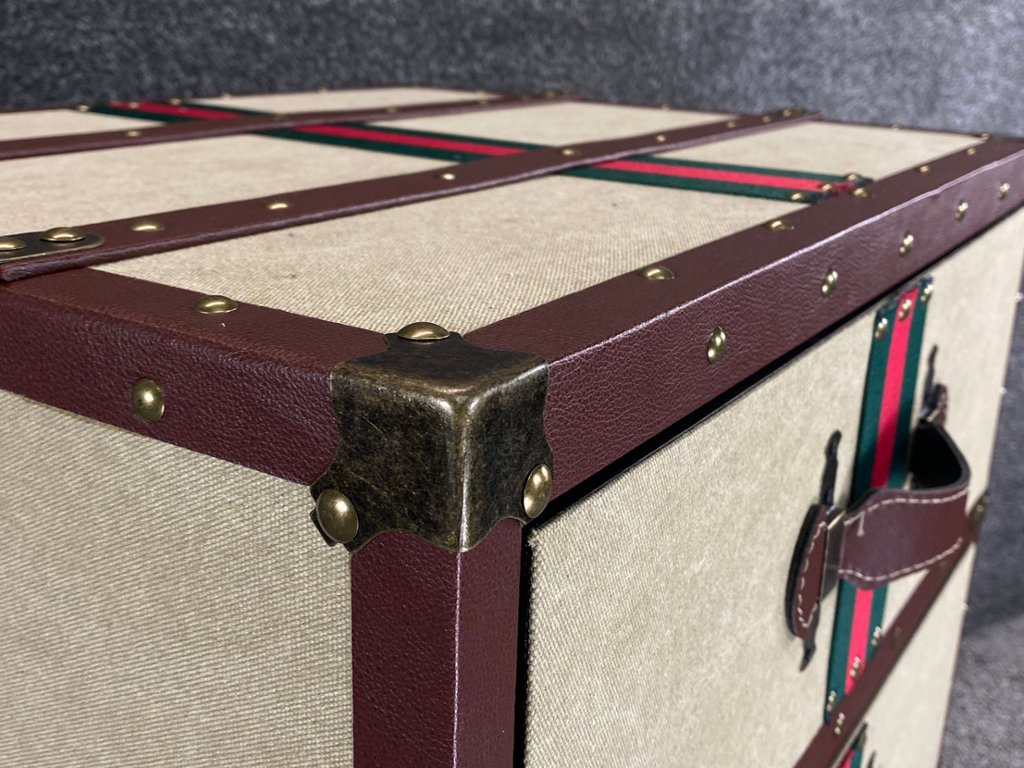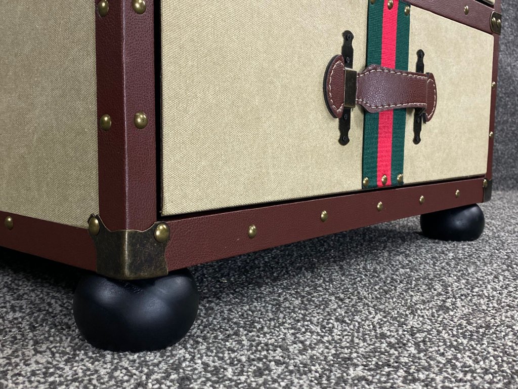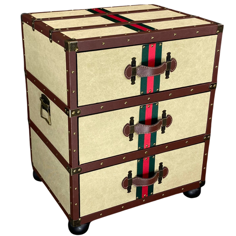 A handbuilt fabric and leather three-drawer side table, where functionality meets exquisite design. Meticulously crafted with attention to detail, this stunning piece features a seamless fusion of luxurious fabric and supple leather, adorned with copper handles and clasps for a touch of sophistication.
