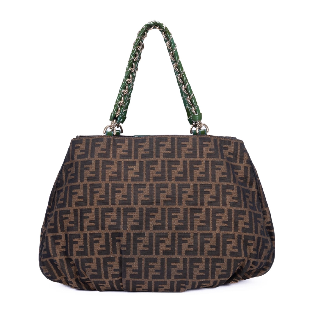 A vintage Mia bag from Fendi, crafted in brown and green canvas featuring the brand’s iconic FF motif. The softly structured silhouette is finished with pleated detailing, chain-linked shoulder straps woven with leather, and a distinctive logo plaque to the front, giving the bag a recognisable and characterful Fendi aesthetic.