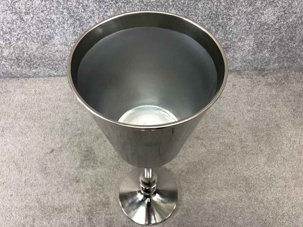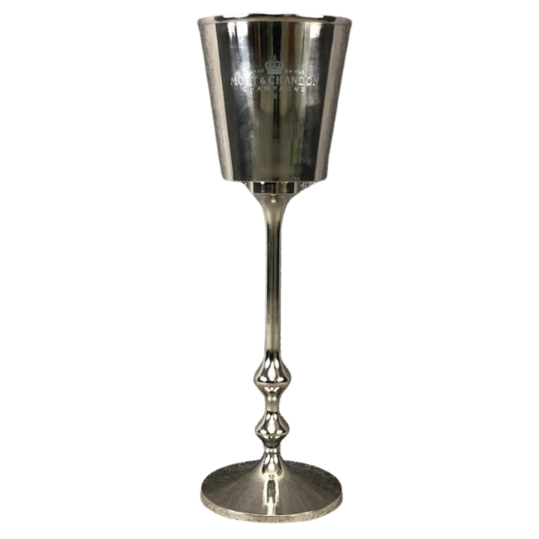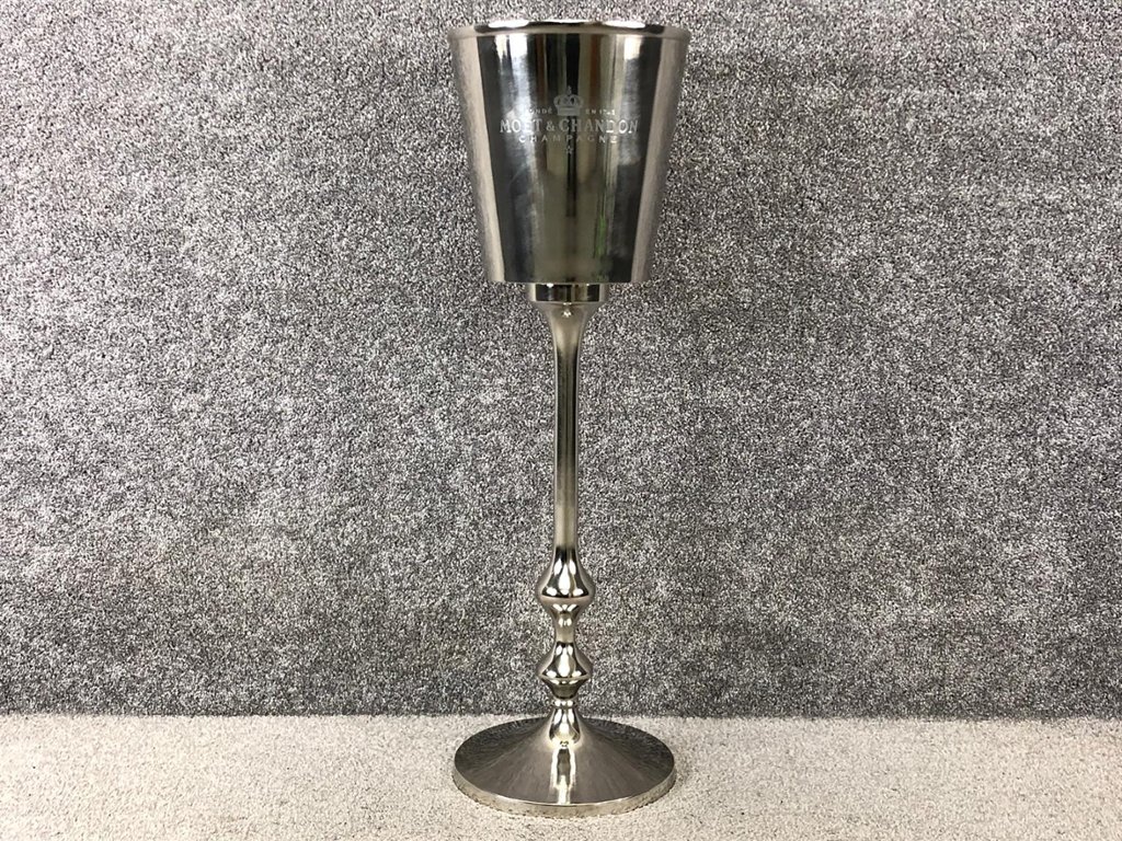 A chrome floor-standing Moët & Chandon Champagne bucket is an exquisite piece of décor that adds sophistication to any setting. Standing at approximately 31 inches tall and 10 inches wide, it commands attention with its elegant design and sleek finish.