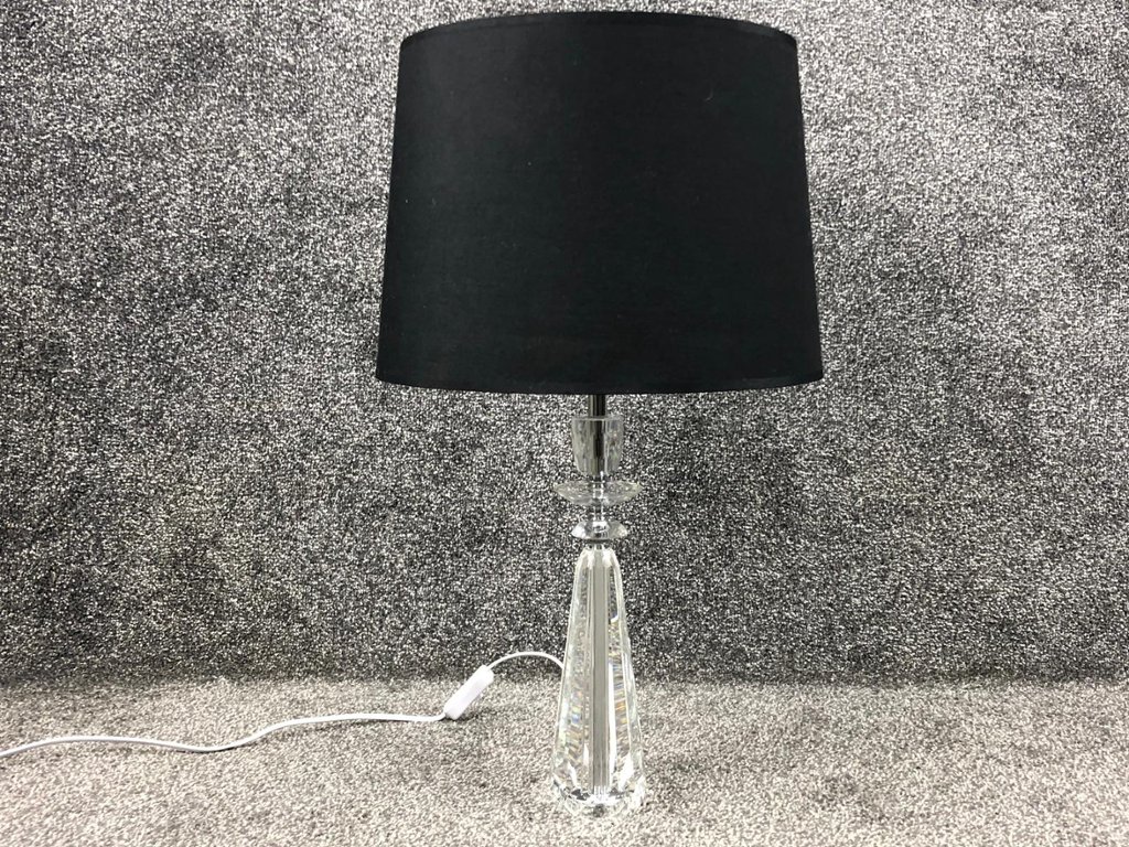 A four part crystal and chrome table lamp with a black shade. Approx 24" height