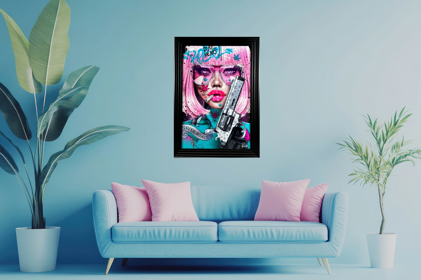 A brand new black-framed Clear Coat Overlay Art Picture that explodes with rebellious energy and modern street-style attitude — this striking piece features a fierce lady with vivid pink hair, bold makeup, and a gun in hand, wrapped in vivid colours and unapologetic symbolism. Measuring 105cm in height and 75cm in width, this artwork is a fearless fusion of pop art, protest, and powerful femininity.