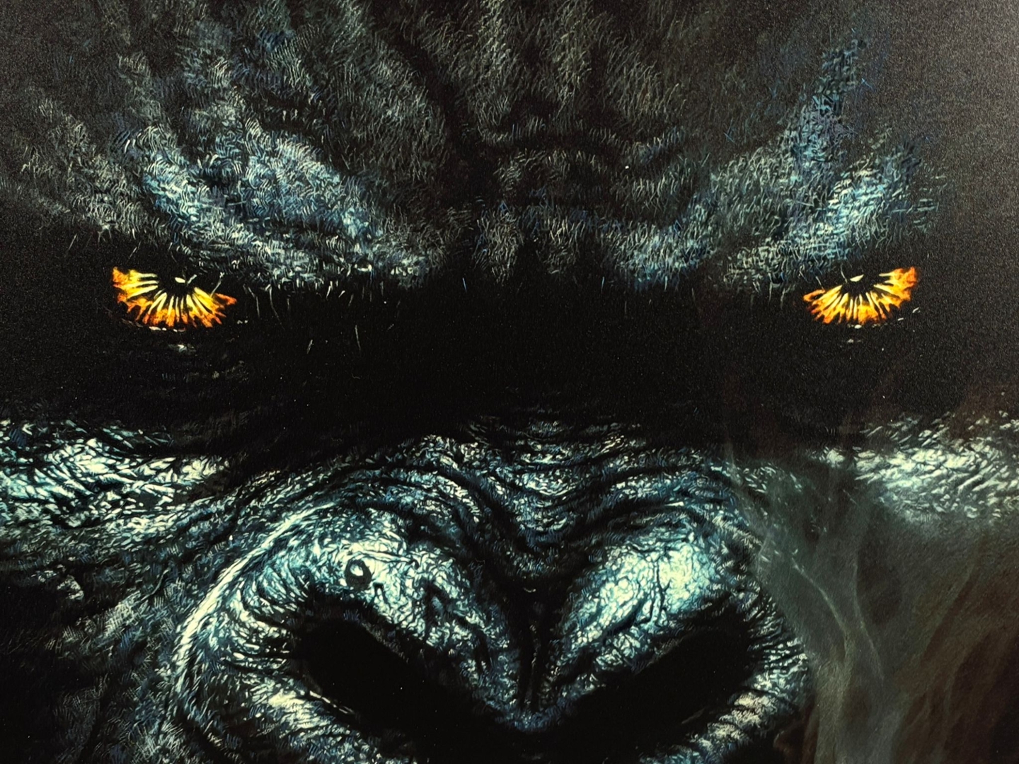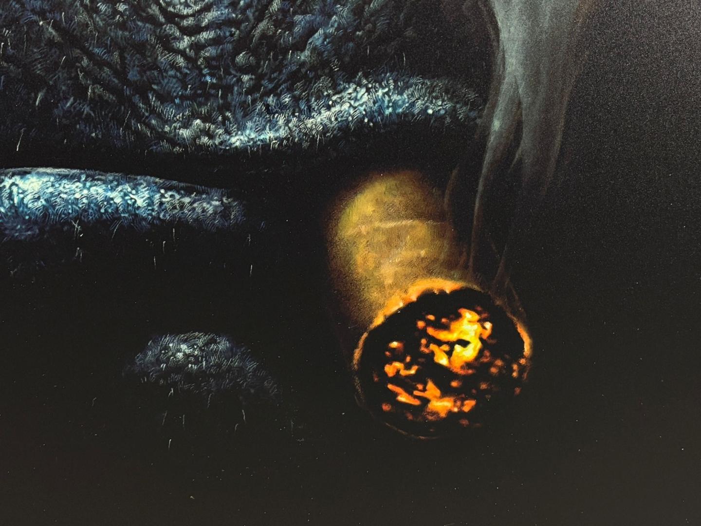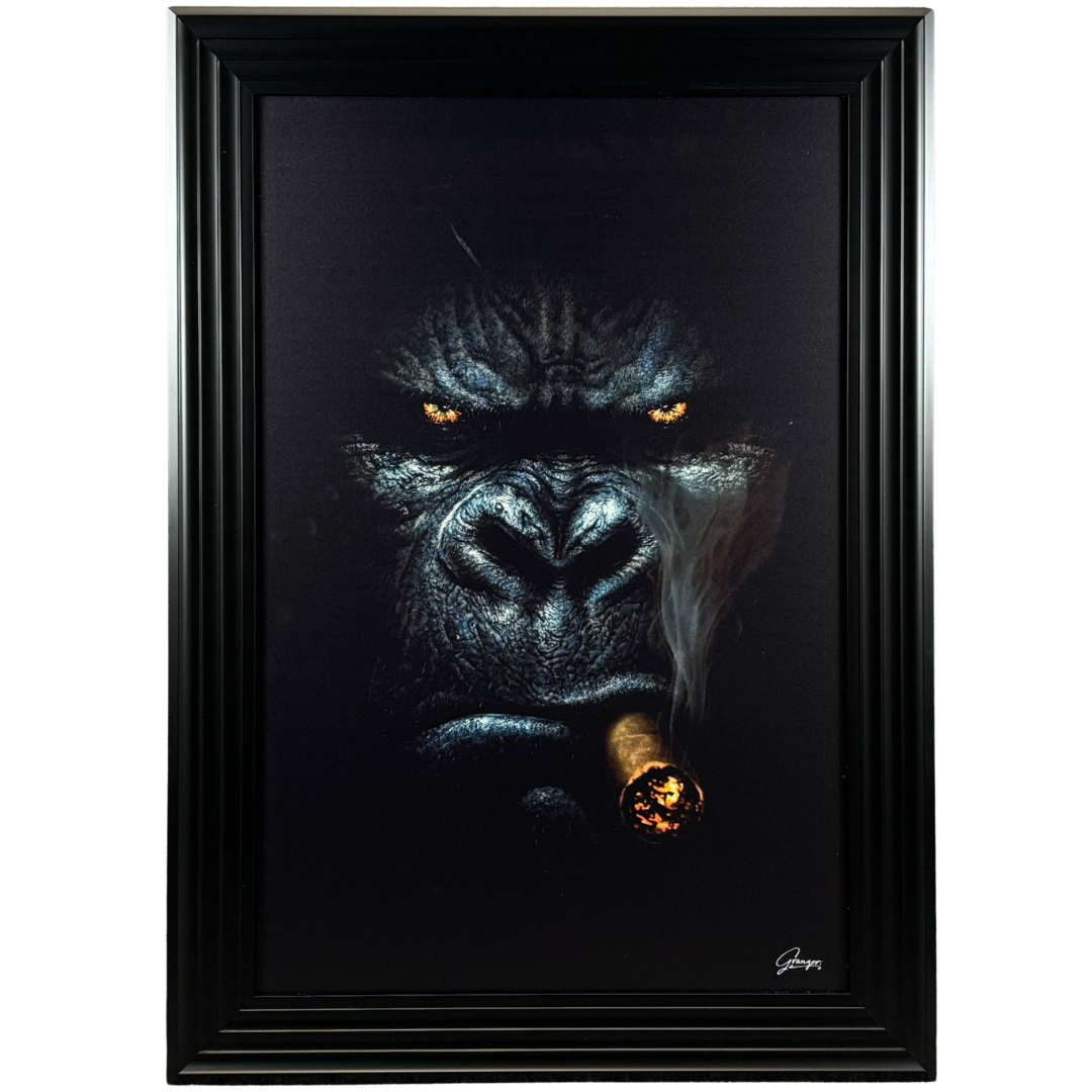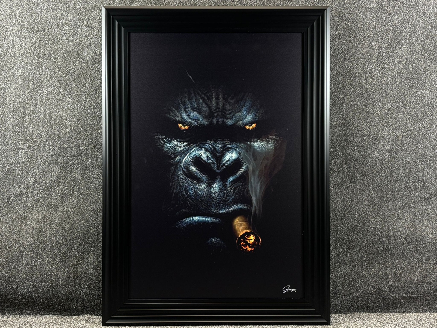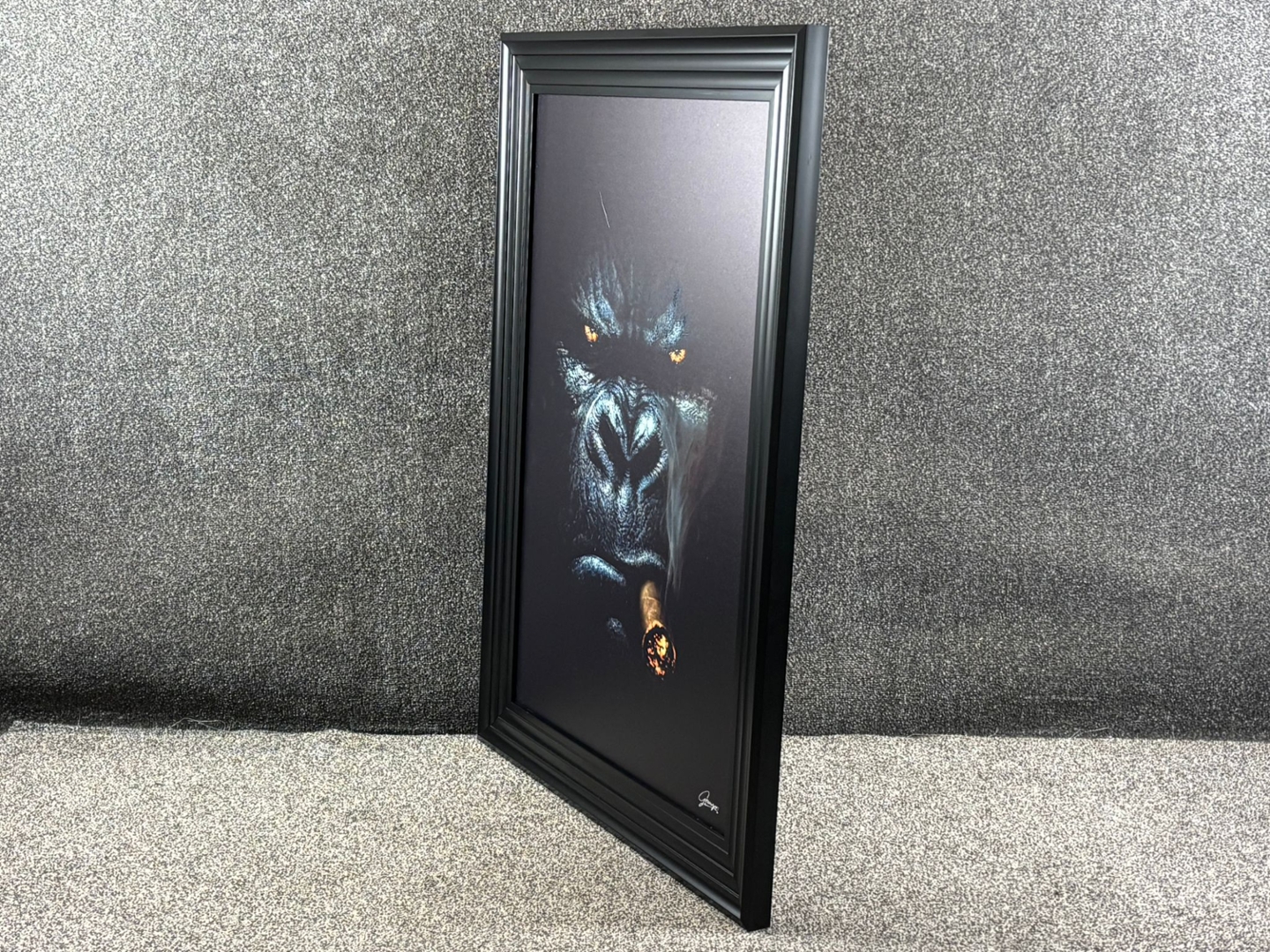 A brand new black framed Clear Coat Overlay Art Picture, this bold and commanding piece titled Smoking Gorilla exudes raw attitude and cinematic intensity. Measuring 105cm in height and 75cm in width, the artwork captures a hyper-realistic gorilla face emerging from the shadows, his piercing golden eyes glowing with unspoken power. Clenched between his lips is a lit cigar, smoke curling upward in dramatic contrast against the deep black background.