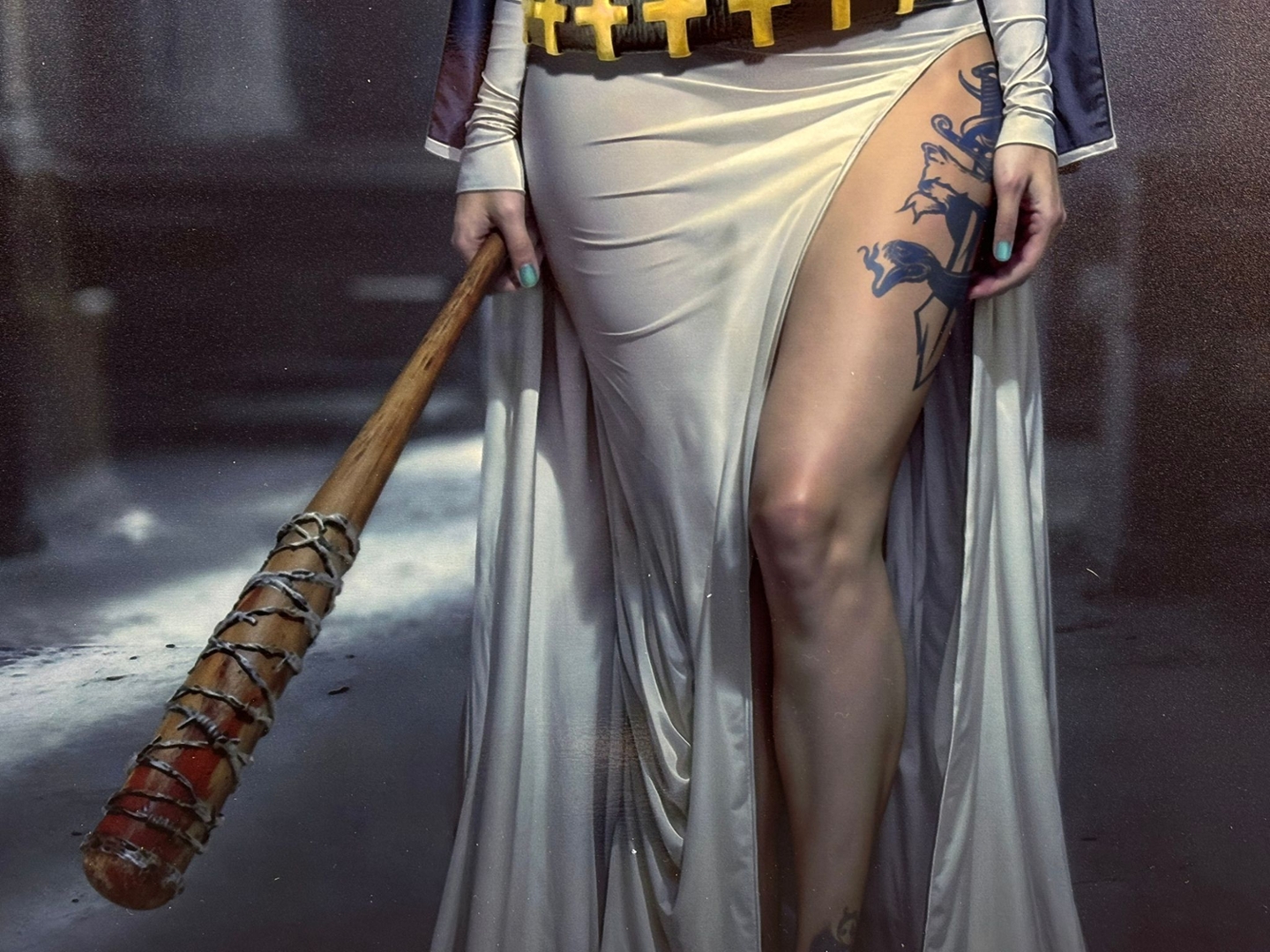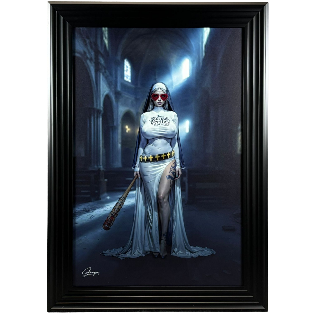 Wearing a white form-fitting gown with the phrase “Corpus Veritas” across her chest, the figure is accessorised with red love-heart sunglasses, a bold yellow belt with cross motifs, and a spiked baseball bat resting confidently at her side. Tattoos adorn her leg and shoulder, and her powerful stance radiates both elegance and defiance. The dark, moody church setting contrasts strikingly with her modern, rule-breaking persona. Finished in a sleek black frame with a high-gloss Clear Coat Overlay, every detail bursts with crisp intensity and visual depth.