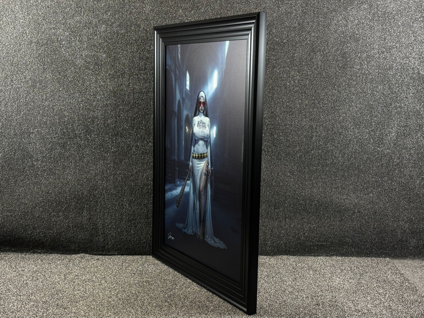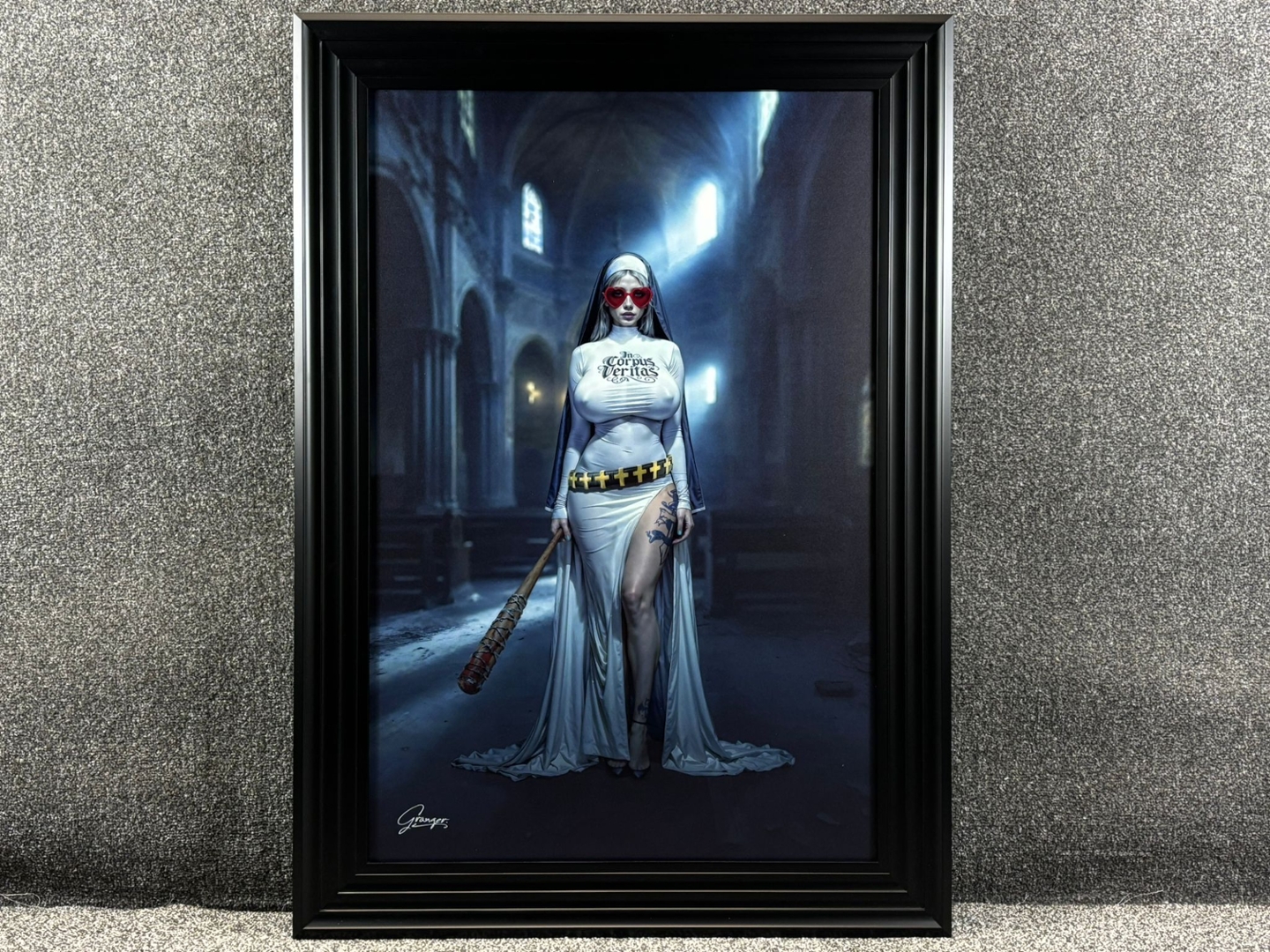 A brand new black-framed Clear Coat Overlay Art Picture that turns tradition on its head — this commanding piece features a fierce nun standing boldly in a dimly lit cathedral, blending divine symbolism with street-style rebellion. Measuring 105cm in height and 75cm in width, it’s a dramatic and fearless work of contemporary art.