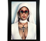 A brand new black framed Clear Coat Overlay Art Picture of a Standing Nun with Love Heart Sunglasses.