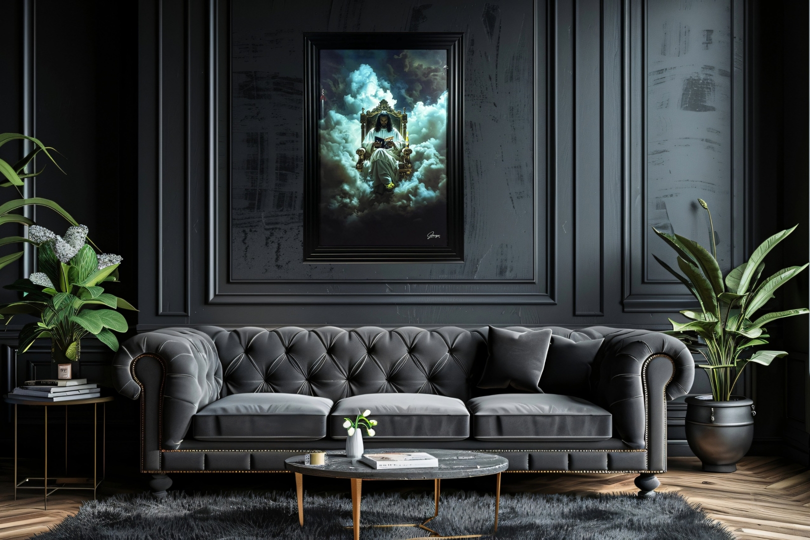 A brand new black-framed Clear Coat Overlay Art Picture that brilliantly blends divine majesty with unexpected humour — this unforgettable piece features Jesus seated on a golden throne high among the clouds, surrounded by a celestial atmosphere. Measuring 105cm in height and 75cm in width, it’s a dramatic and imaginative fusion of reverence and modern wit.