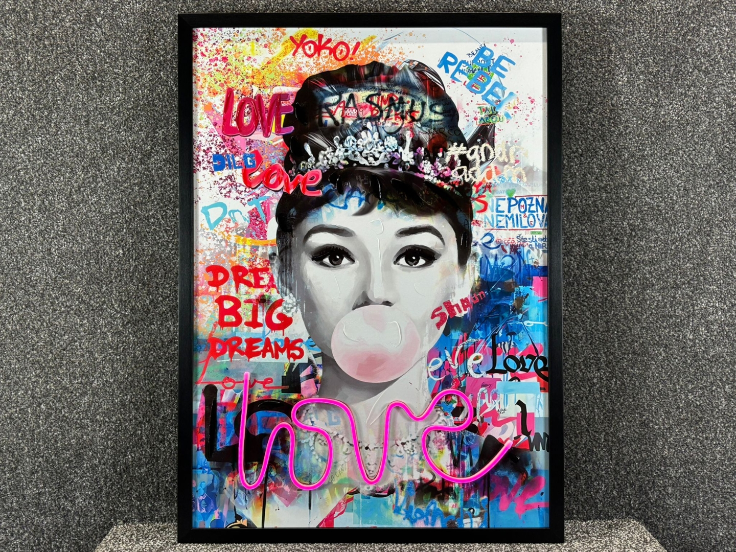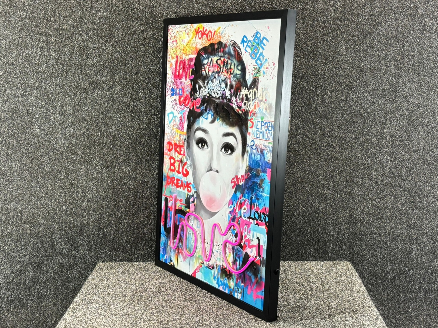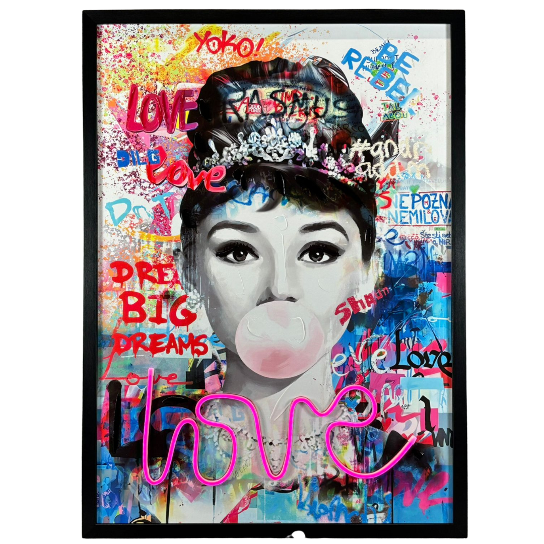 A framed LED wall art picture of Audrey Hepburn titled ‘Love,’ measuring approximately 73cm in height and 53cm in width. This striking piece reimagines the timeless elegance of Hepburn with a vibrant pop-art twist. The black-and-white portrait captures her iconic beauty, enhanced with playful details including a pink bubblegum bubble and a sparkling tiara.