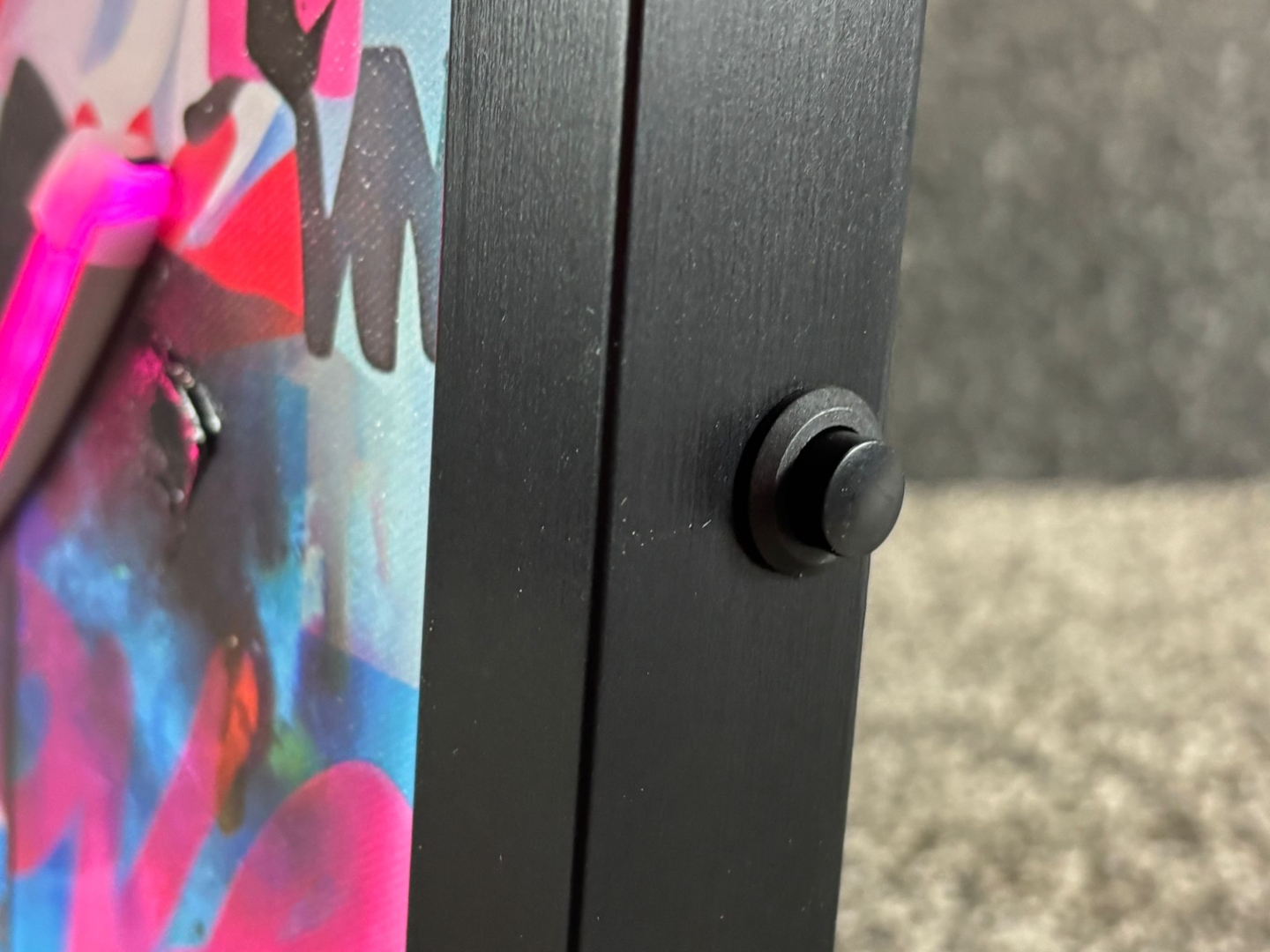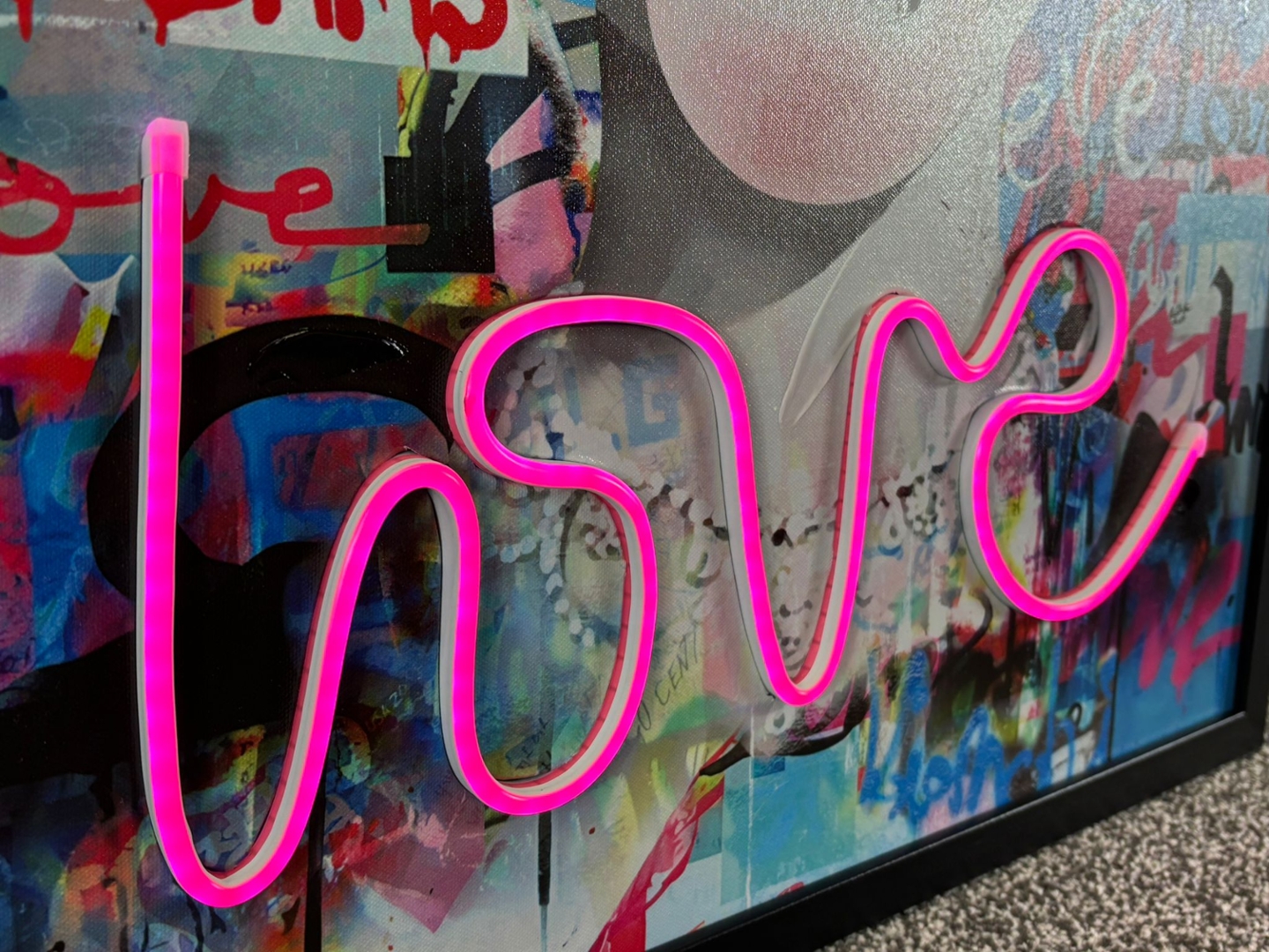 Surrounding the portrait is a dynamic backdrop of graffiti-inspired text and colourful paint splashes, featuring uplifting phrases like “Dream Big Dreams,” “Love,” and “Be Rebel.” The integrated LED lighting forms the word “love” in vivid pink neon-style lettering, adding a bold, modern highlight that stands out both day and night.