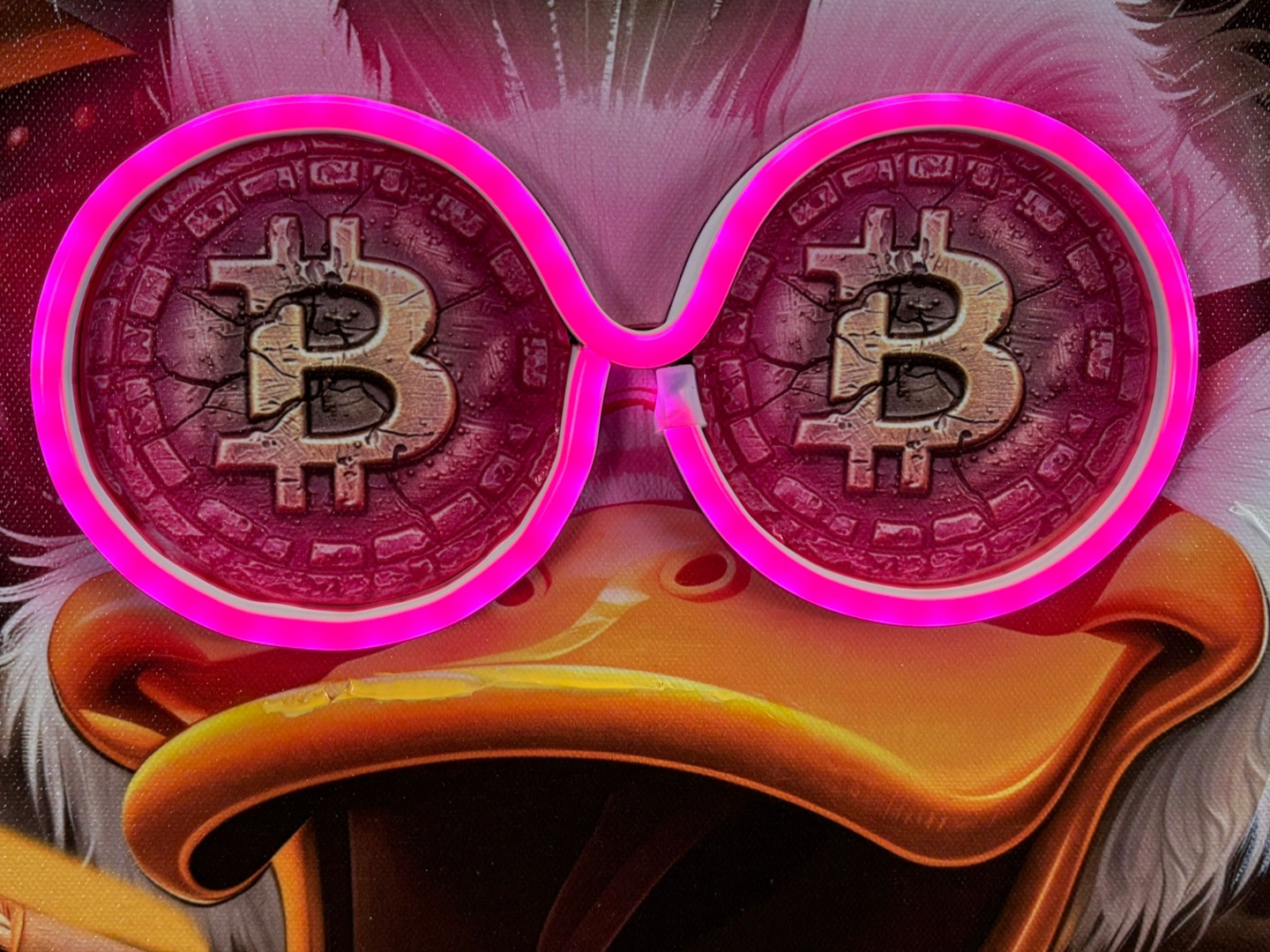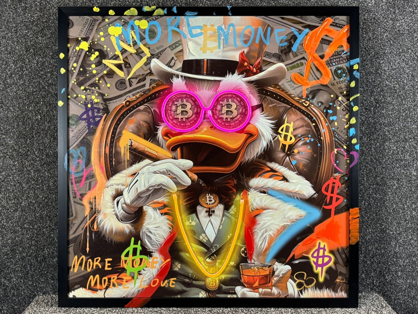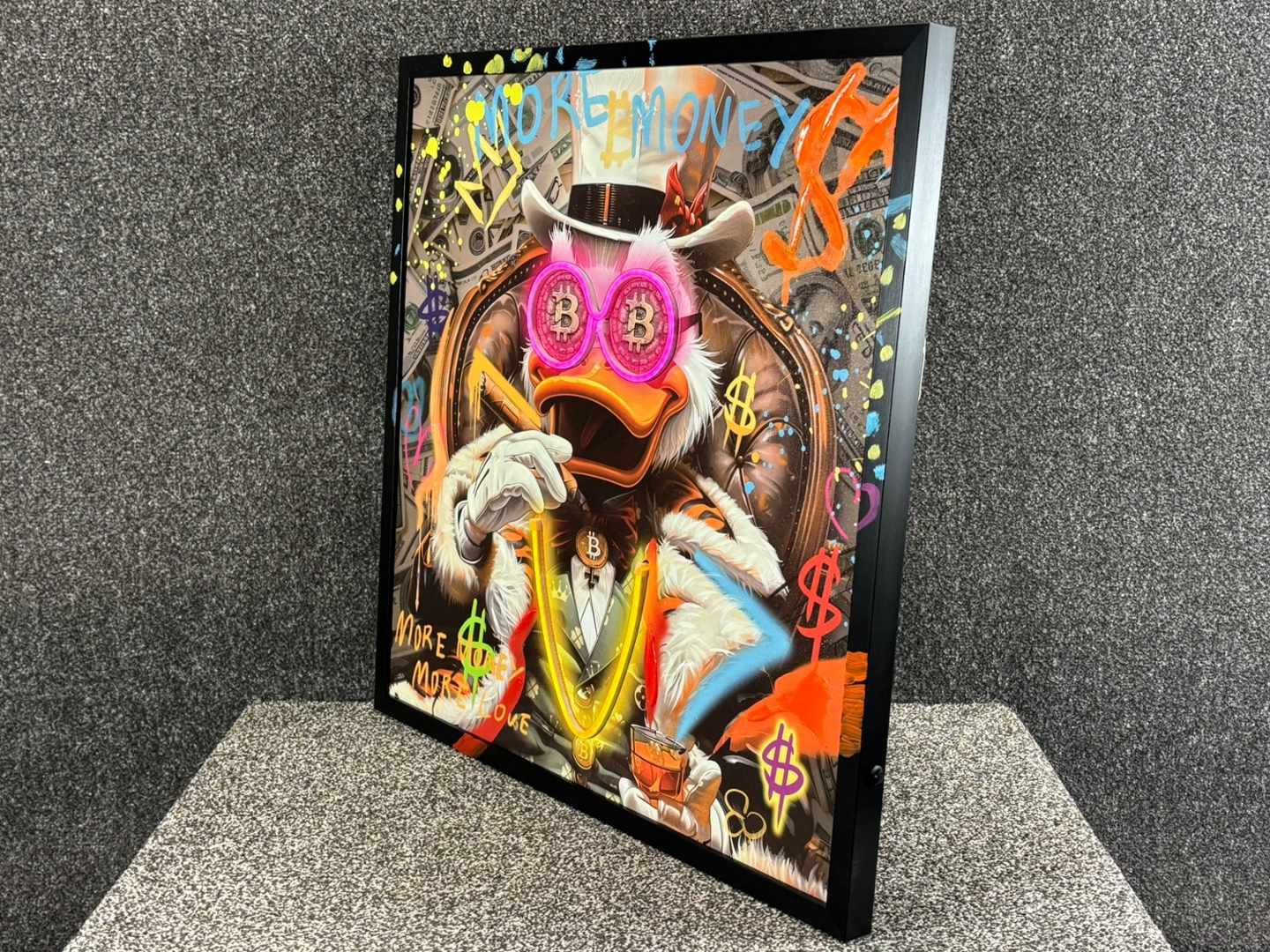A framed LED wall art picture of Scrooge McDuck, measuring approximately 63cm in height and 63cm in width. This vibrant and playful piece reimagines the classic Disney character with a modern, street-art twist. Scrooge is depicted in his signature top hat and fur-trimmed coat, holding a glass of whiskey and a cigar, set against a money-themed background. His look is upgraded with neon-pink Bitcoin glasses and a glowing yellow necklace, adding a contemporary crypto-inspired flair.