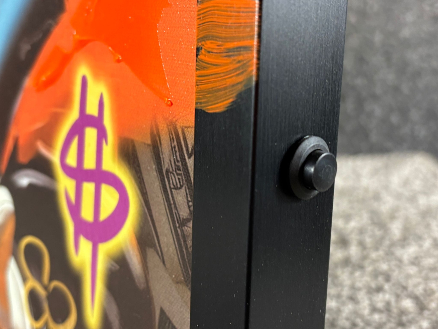 Graffiti-style details, including dollar signs, hearts, and phrases like “More Money,” inject an urban, edgy energy into the artwork. The integrated LED lighting enhances the glasses and necklace, creating a striking illuminated effect that stands out both day and night.