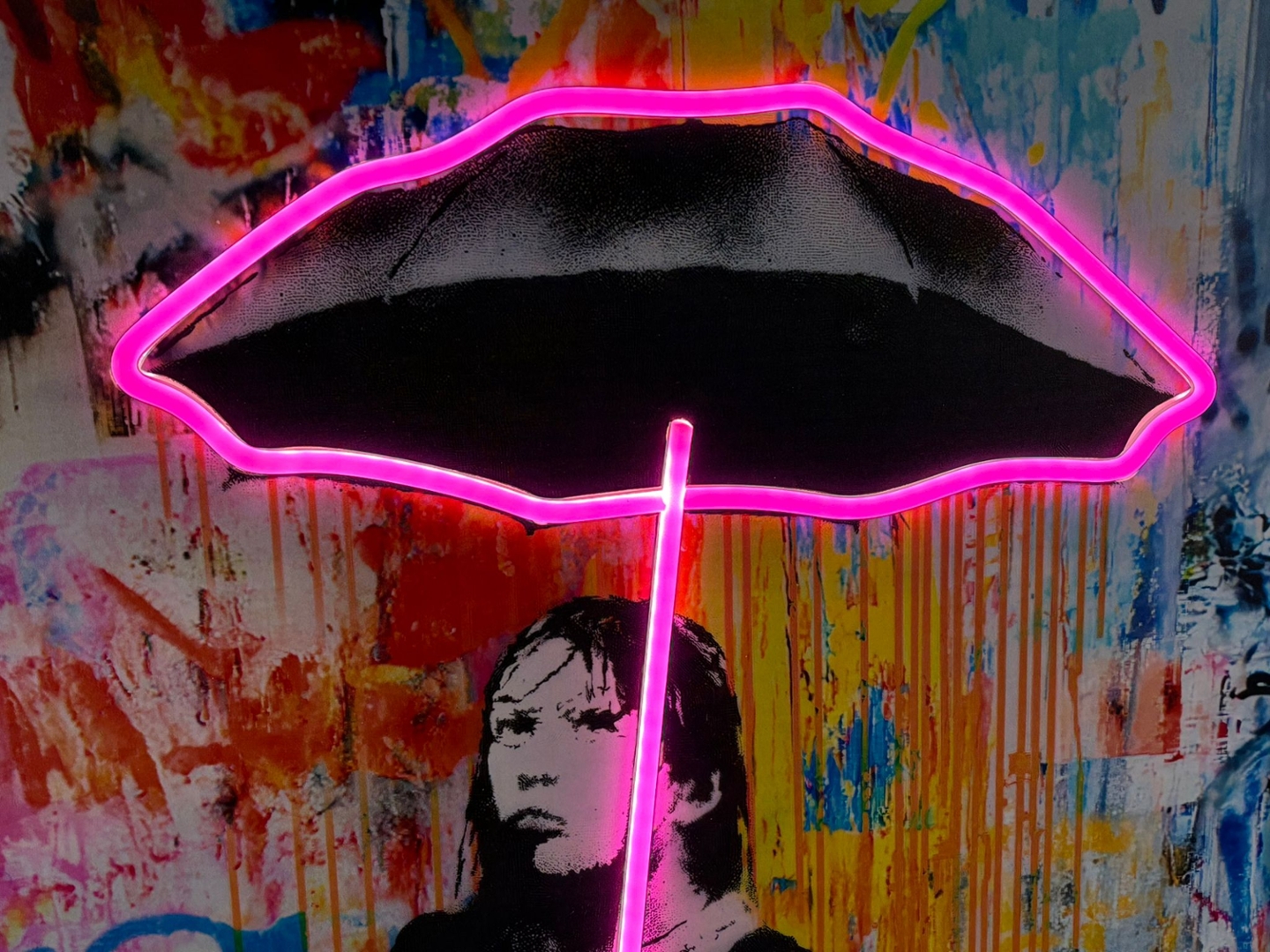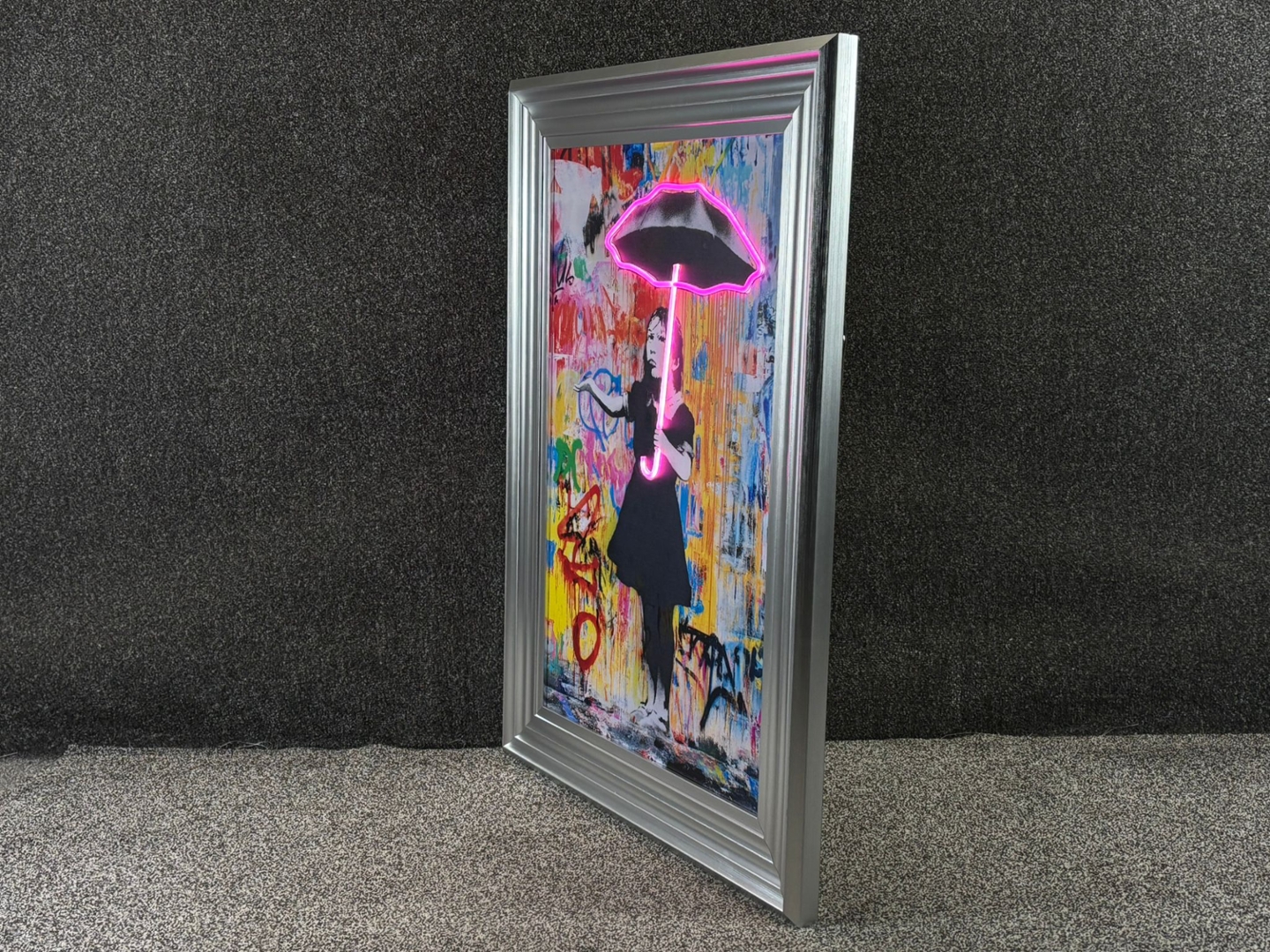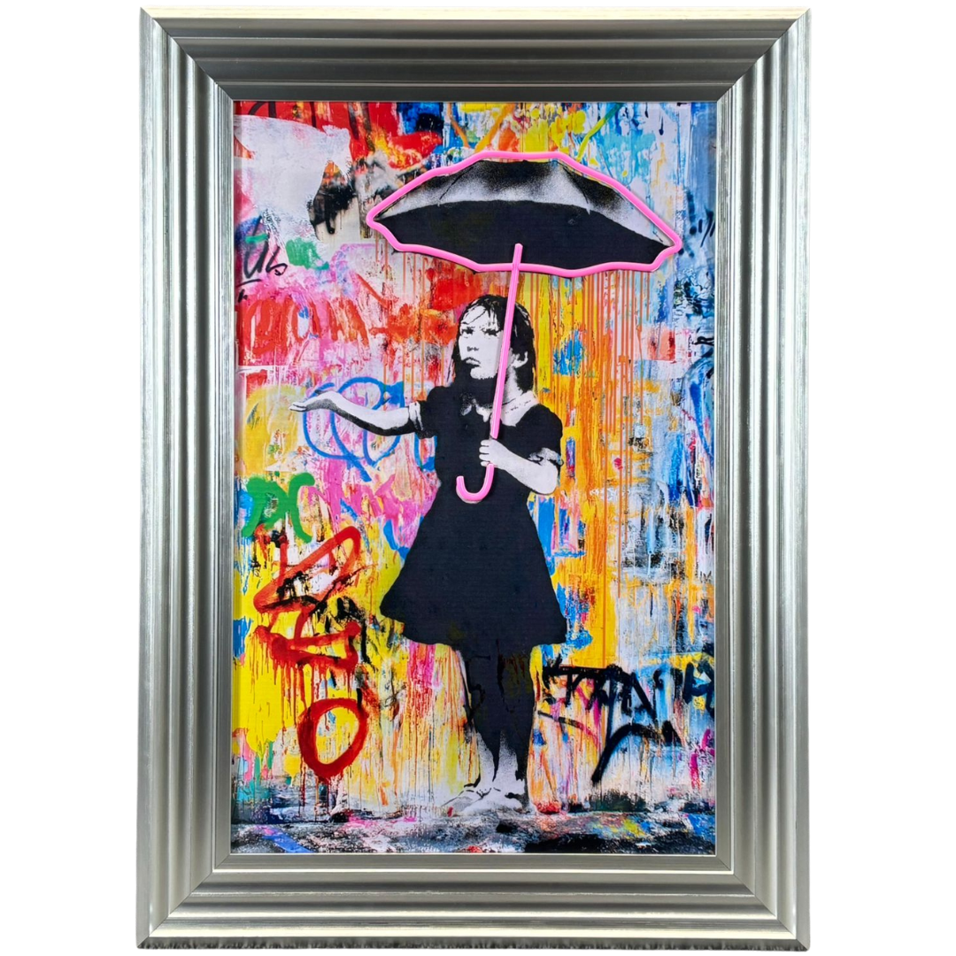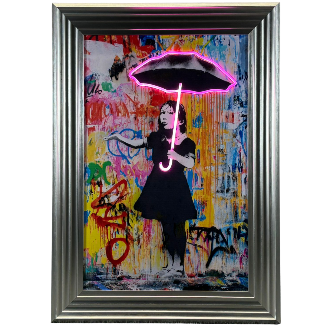 A brand new silver framed LED wall art Banksy picture featuring a Graffiti Girl with an Umbrella, brought to life with vibrant neon detailing. This striking artwork blends Banksy’s iconic stencil style with a bold, multicoloured graffiti backdrop, creating a captivating centrepiece that instantly energises any room. The umbrella’s neon outline illuminates in a vivid pink glow, contrasting beautifully with the moody monochrome figure and the chaotic spray-paint textures behind her, giving the piece a modern, urban edge.