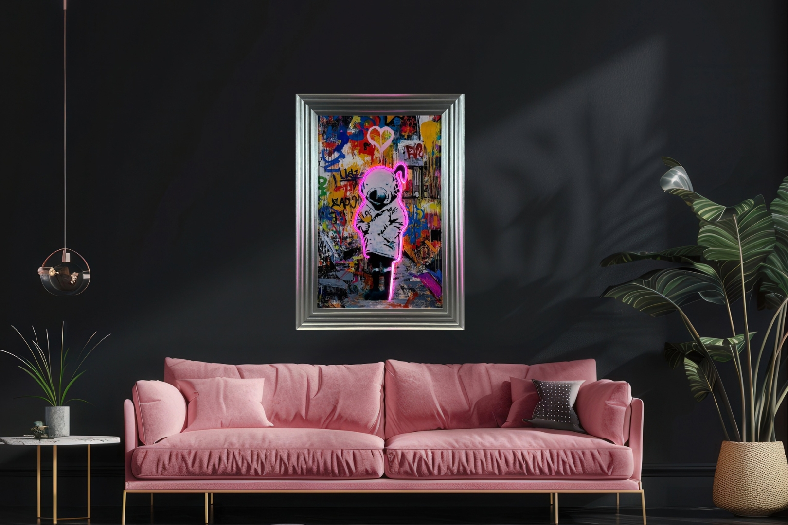 - > Framed LED Wall Art Banksy Picture of a Graffiti Space Girl & Bird