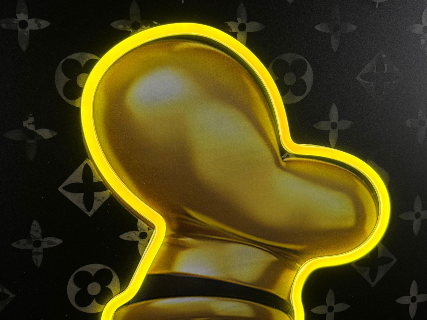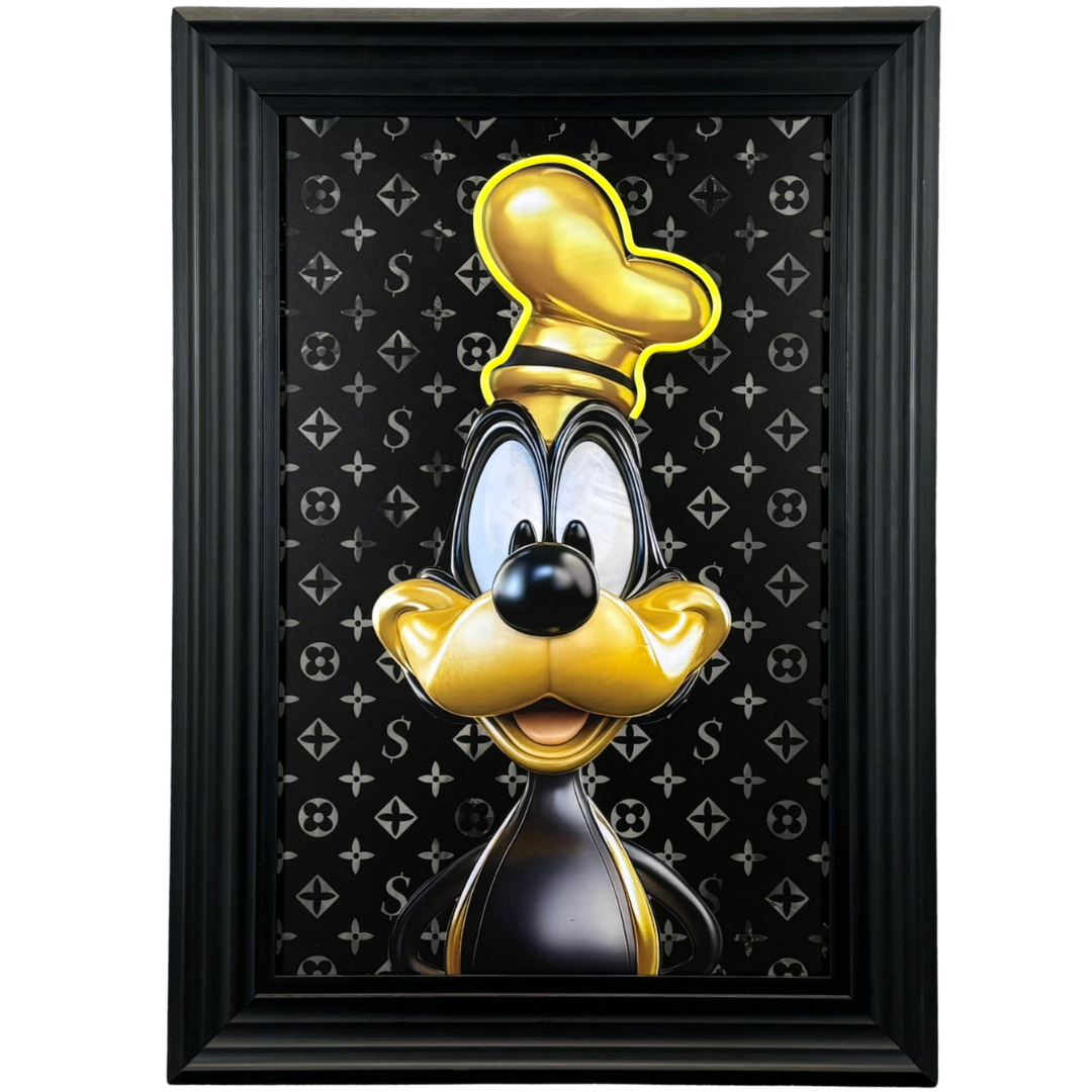 A brand new black framed LED wall art picture of a Designer Goofy, presented in a bold and modern style that instantly commands attention. Set against a luxury-inspired patterned backdrop, Goofy appears in a vibrant golden colourway, with his iconic hat illuminated by integrated yellow LED lighting. The combination of crisp detailing and glowing accents gives the piece a lively, animated presence that stands out beautifully in any setting.