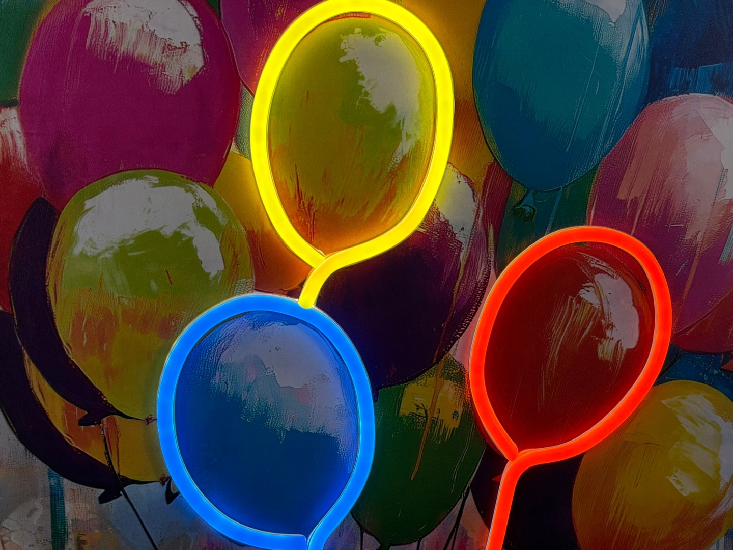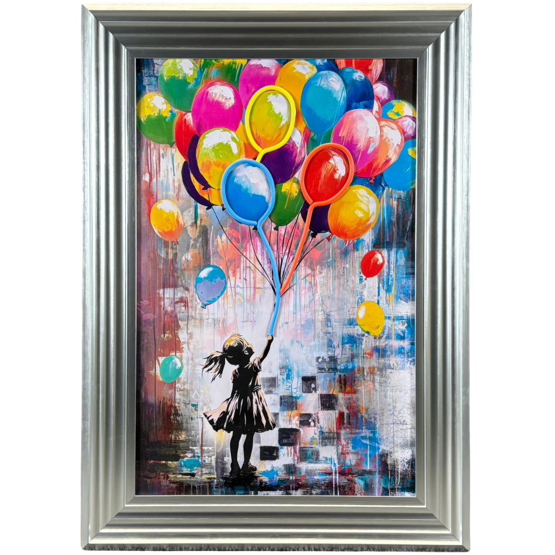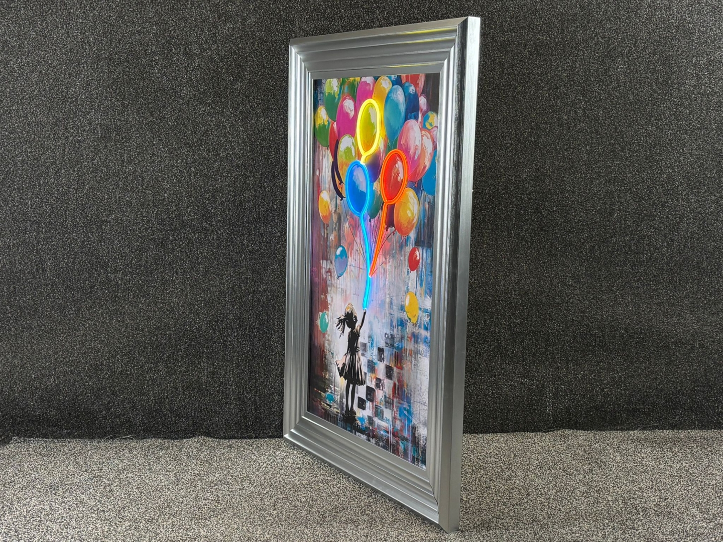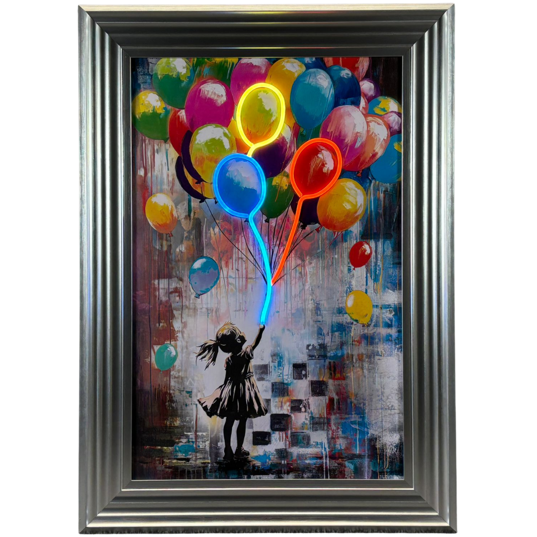 A brand new silver framed LED wall art picture showcasing a vibrant scene of a girl reaching up toward a colourful cluster of balloons. The artwork blends graffiti textures, expressive brushwork, and bold drips of colour to create a lively, modern street-art aesthetic. The integrated LED lights illuminate selected balloons in bright neon tones, adding depth, energy, and a dynamic glow that instantly transforms the piece when switched on. As a rule, these LED artworks look fantastic with the lights both on and off, offering versatility for any interior.
