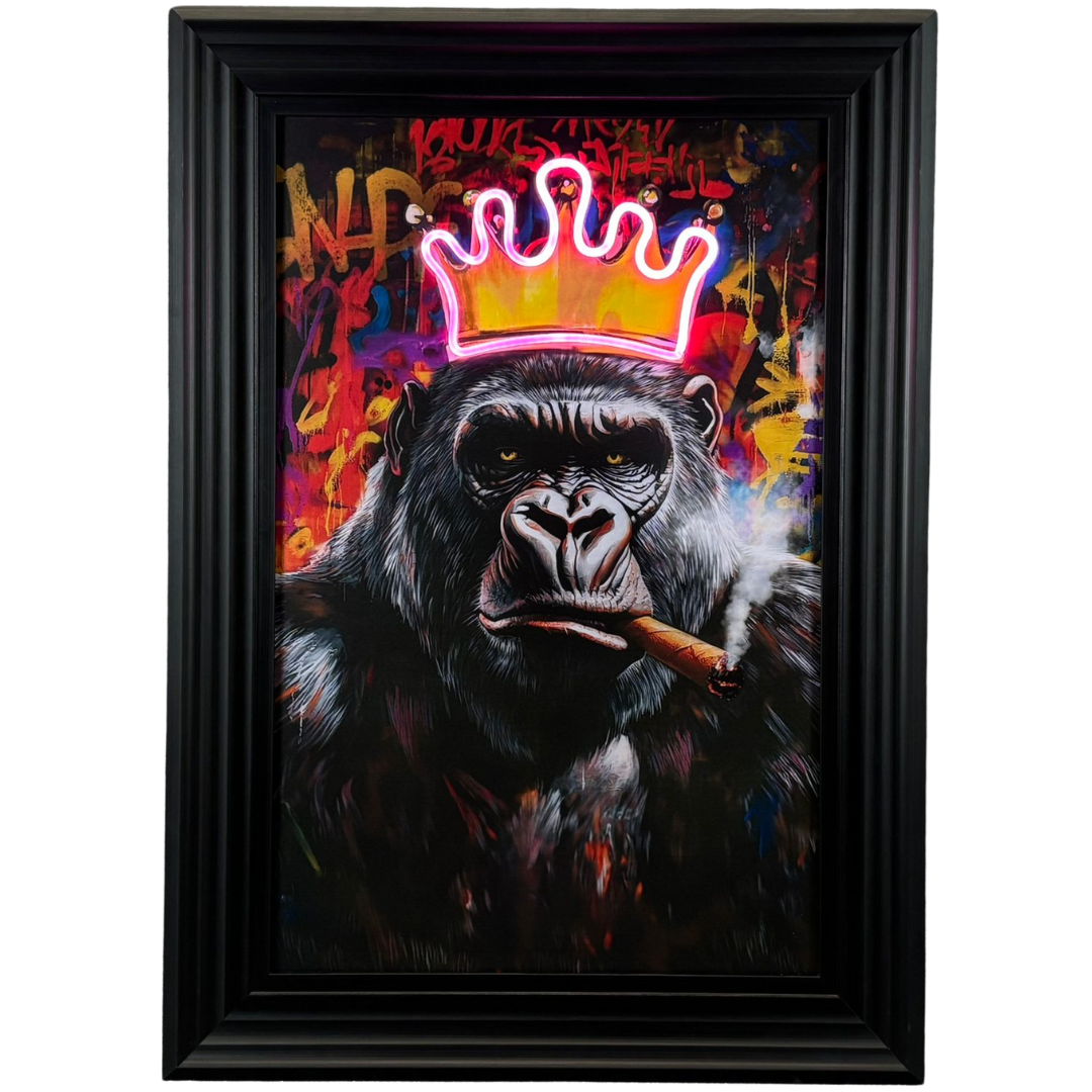 A brand new black framed LED wall art picture of a King Gorilla, bursting with attitude and bold personality. This striking piece blends gritty street-art energy with vibrant urban colour, creating an unforgettable focal point for any modern interior. The Gorilla’s intense expression, paired with the vivid graffiti backdrop, gives the artwork an exciting edge, while the neon-style LED crown adds a commanding glow that instantly stands out whether the lights are on or off.