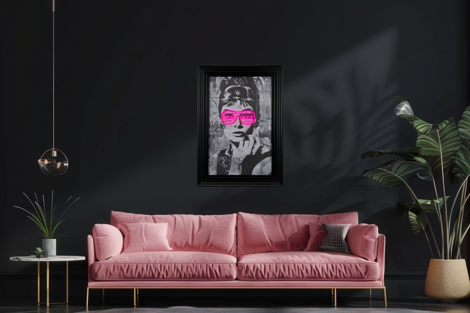 A brand new black framed LED wall art picture showcasing Audrey Hepburn from Breakfast at Tiffany’s, reimagined with a bold street-art twist. The monochrome portrait sets a sophisticated tone, while the vivid neon-pink LED glasses create an unforgettable pop of colour and energy. The contrast between classic Hollywood elegance and modern urban edge gives this piece incredible impact, making it a standout feature in any contemporary space.
