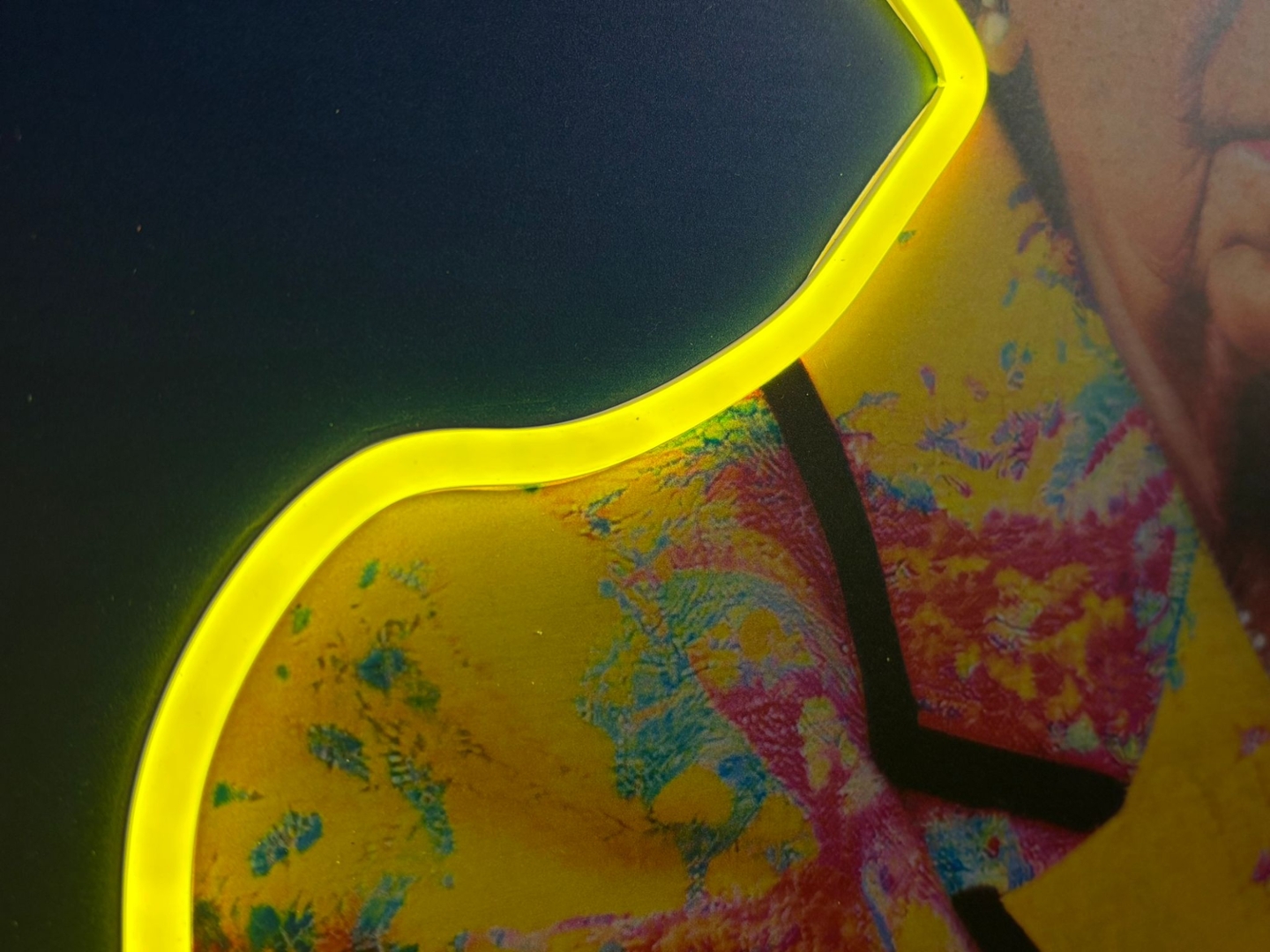 vibrant, multicoloured outfit, contrasted against a dark background