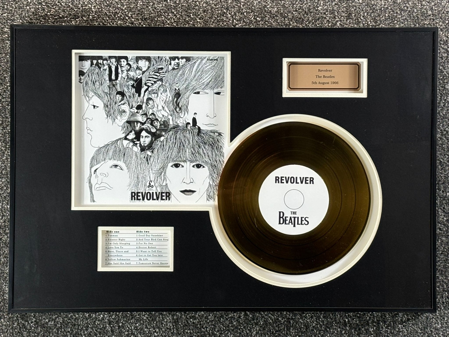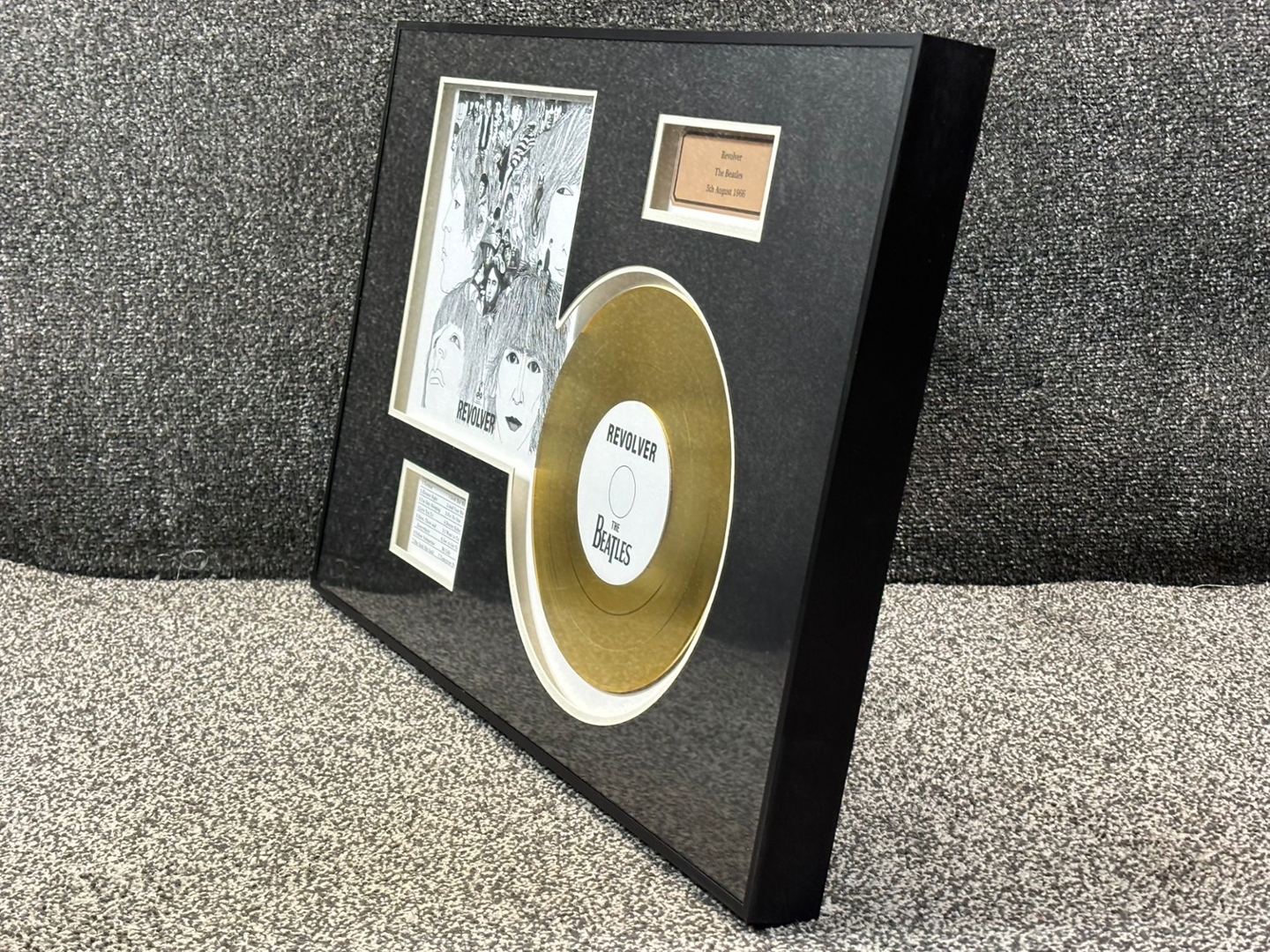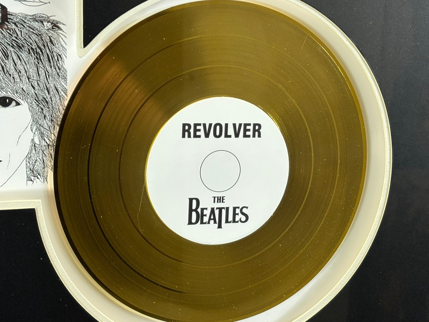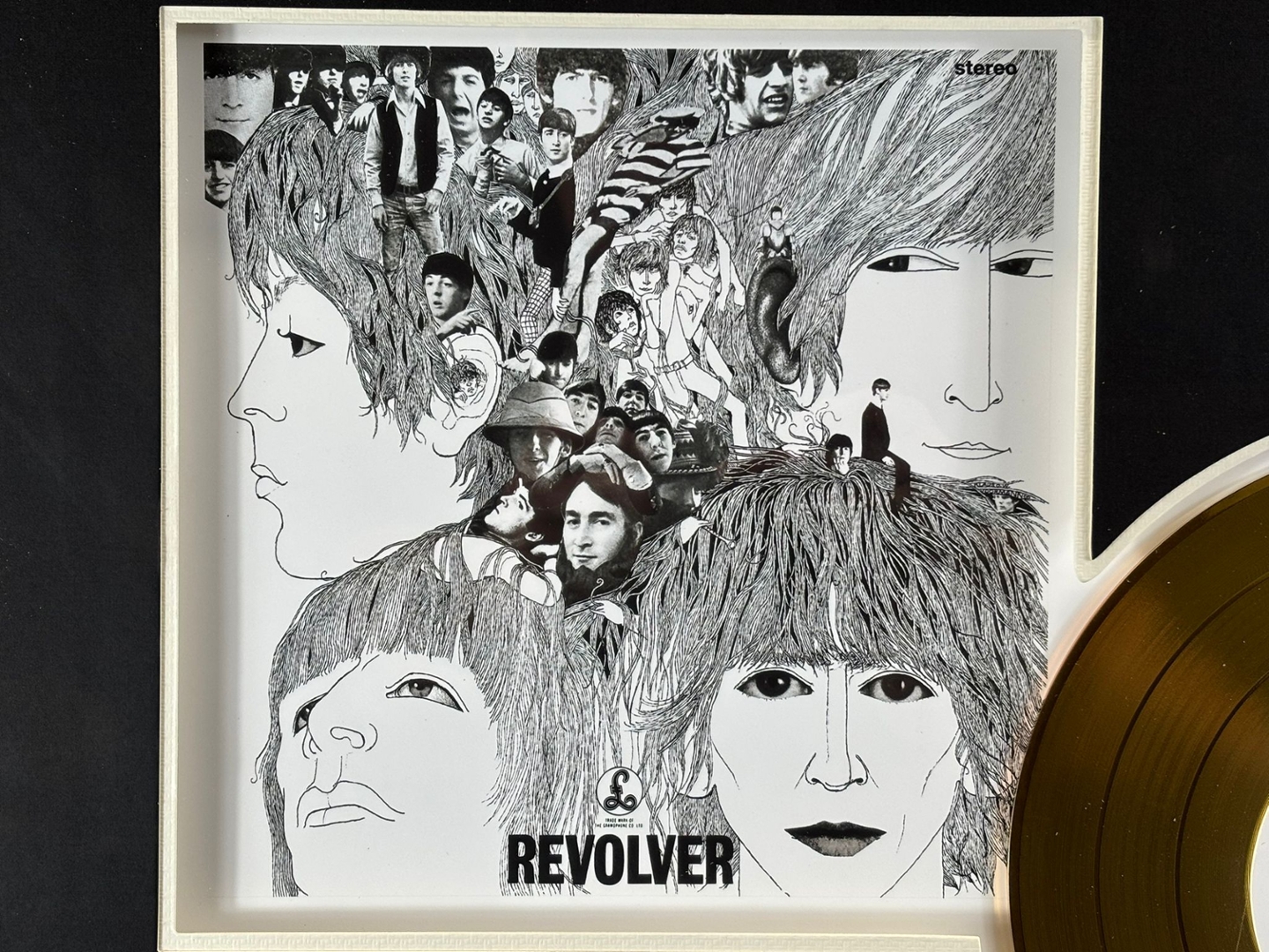 A framed display of Revolver by The Beatles — an album that redefined the boundaries of rock and pop forever. Released on 5th August 1966, Revolver marked a turning point in the Beatles' creative journey, blending groundbreaking studio experimentation with unforgettable songwriting. This stunning tribute features the iconic black-and-white Klaus Voormann cover artwork, a gleaming gold-tone vinyl LP, and a detailed track listing showcasing legendary tracks like “Eleanor Rigby,” “Tomorrow Never Knows,” and “Taxman.”