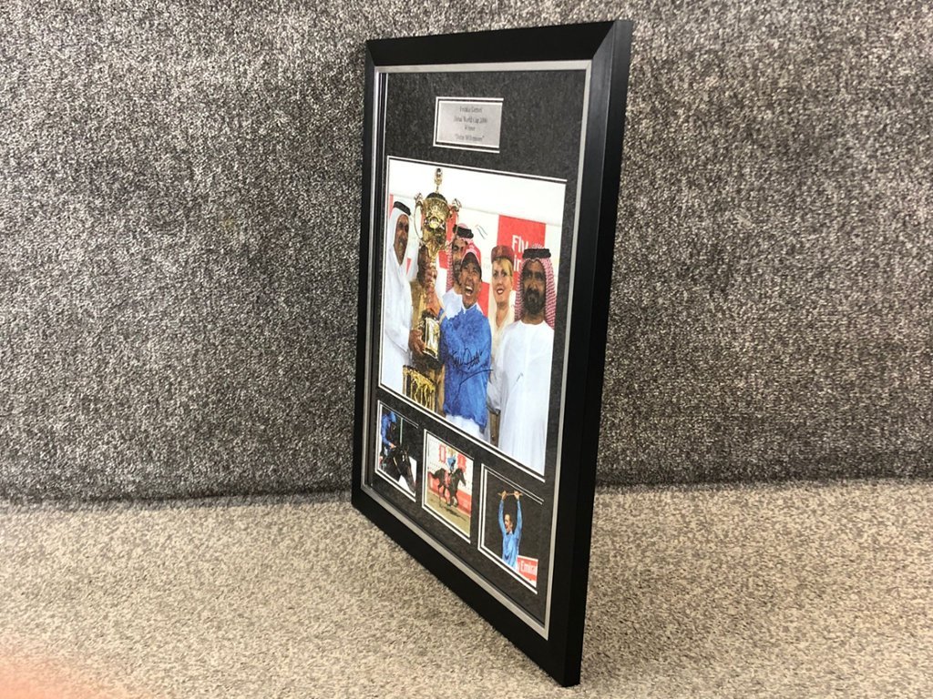 A signed and authenticated Frankie Dettori Dubai World Cup picture elegantly presented in a custom presentation frame. This collectable showcases the signature of the legendary jockey Frankie Dettori, ensuring its authenticity and value.