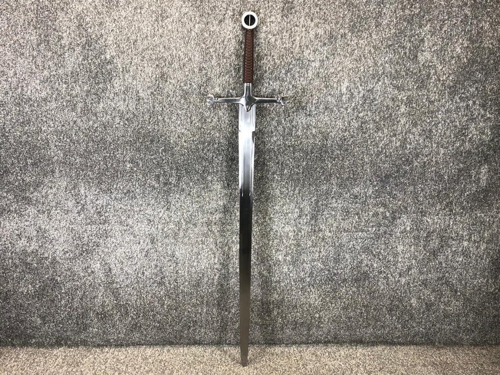 With an impressive overall length of approximately 55 inches, this Gallowglass sword commands attention with its imposing size and formidable presence. The blade is expertly crafted to mirror the traditional design of the Gallowglass sword, featuring a broad, double-edged blade with a distinctive crossguard and pommel.
