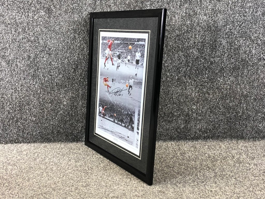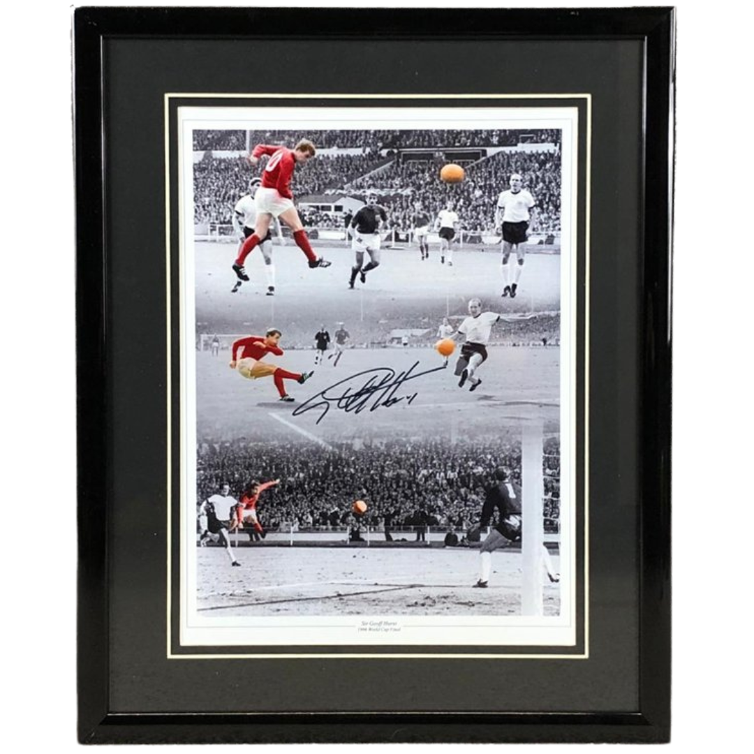 A signed and authenticated Geoff Hurst England Hat-Trick picture, capturing the unforgettable moments from the 1966 FIFA World Cup Final. This historic event saw Sir Geoff Hurst score the only hat-trick ever achieved in a World Cup final, securing England’s 4-2 victory over West Germany. The striking design features a sequence of images from the match, with selective colour bringing Hurst’s red England kit and the classic orange ball into sharp focus against the black-and-white background.
