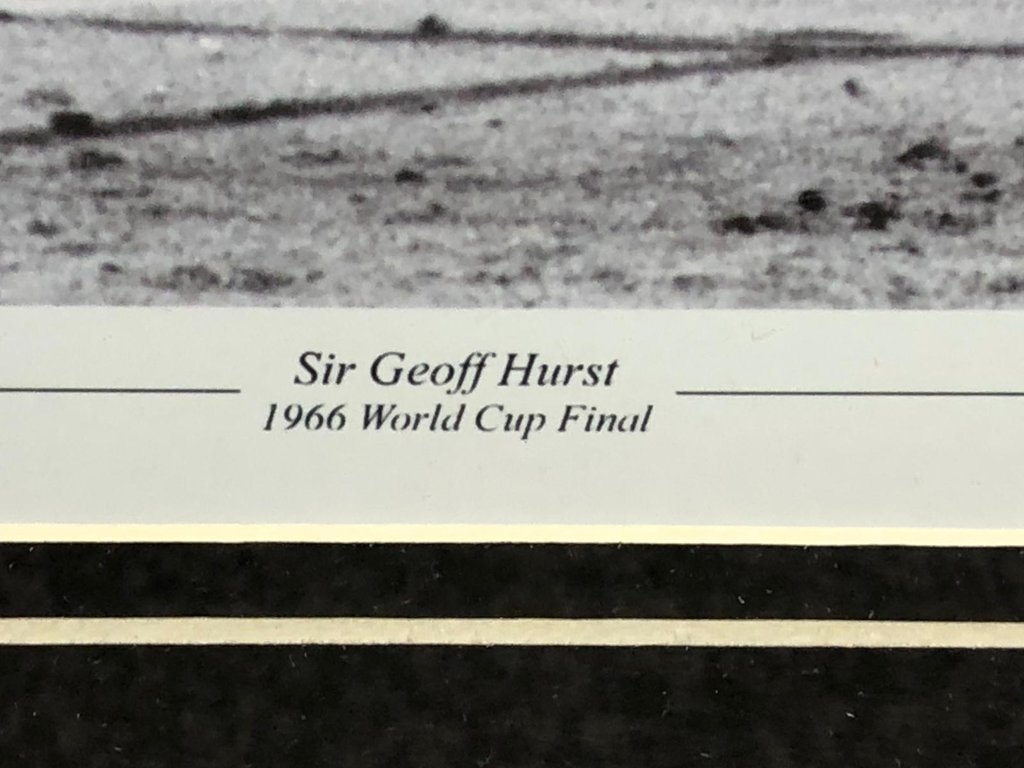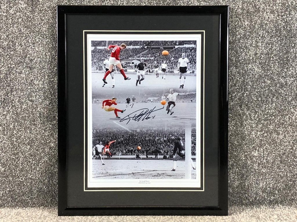 A signed and authenticated Geoff Hurst England Hattrick picture in a presentation frame. Approx 22" height, 18" width.