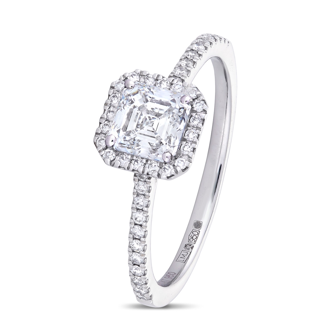 Surrounding the centre stone is a finely set halo of brilliant-cut diamonds, designed to enhance the Asscher cut’s striking geometry while adding a radiant frame of light. The sparkle continues down the shoulders, where additional brilliant-cut diamonds are intricately set for a seamless, flowing design. These accent stones total 0.12 ct. They are graded F-G in colour and VS1-VS2 in clarity, offering a high-quality finish and refined brilliance that perfectly complements the central stone.