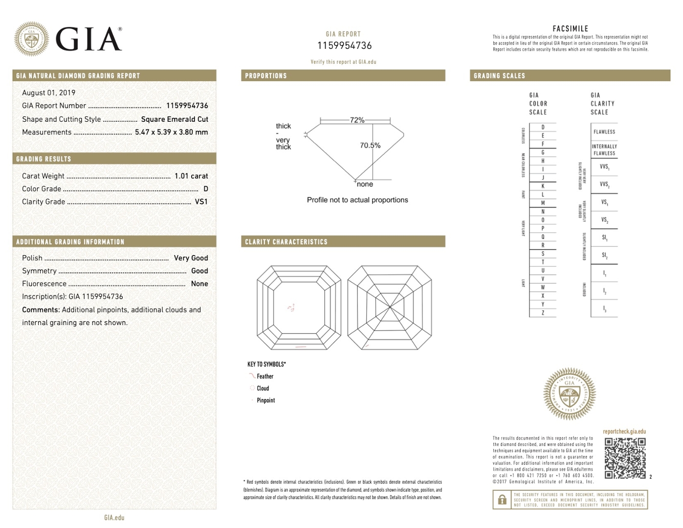 A brand-new, unused GIA-certified natural diamond solitaire engagement ring, set in platinum and centred with a superb 1.01ct Asscher-cut diamond. Graded D colour and VS1 clarity, the centre stone sits within the highest tier of colour grading, displaying a crisp, icy whiteness and exceptional transparency. The distinctive step-cut facets of the Asscher create a captivating hall-of-mirrors effect, offering depth, symmetry and refined flashes of light that emphasise precision and purity.