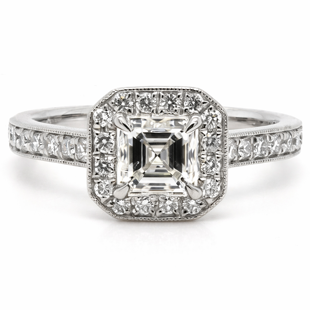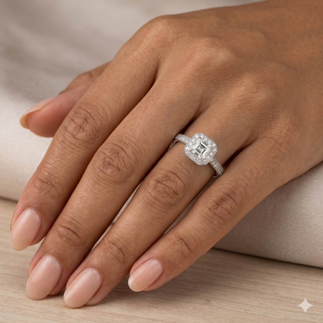 Surrounding the centre is a delicate halo of brilliant-cut natural diamonds, extending elegantly along the shoulders and adding a further 0.30ct in total. These accent stones introduce lively sparkle that contrasts beautifully with the structured geometry of the Asscher cut, enhancing overall presence without overwhelming the centre stone. The platinum setting provides a naturally white, enduring framework that complements the diamonds while ensuring strength and security.