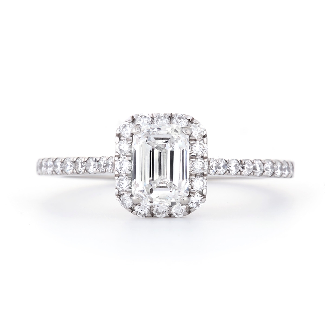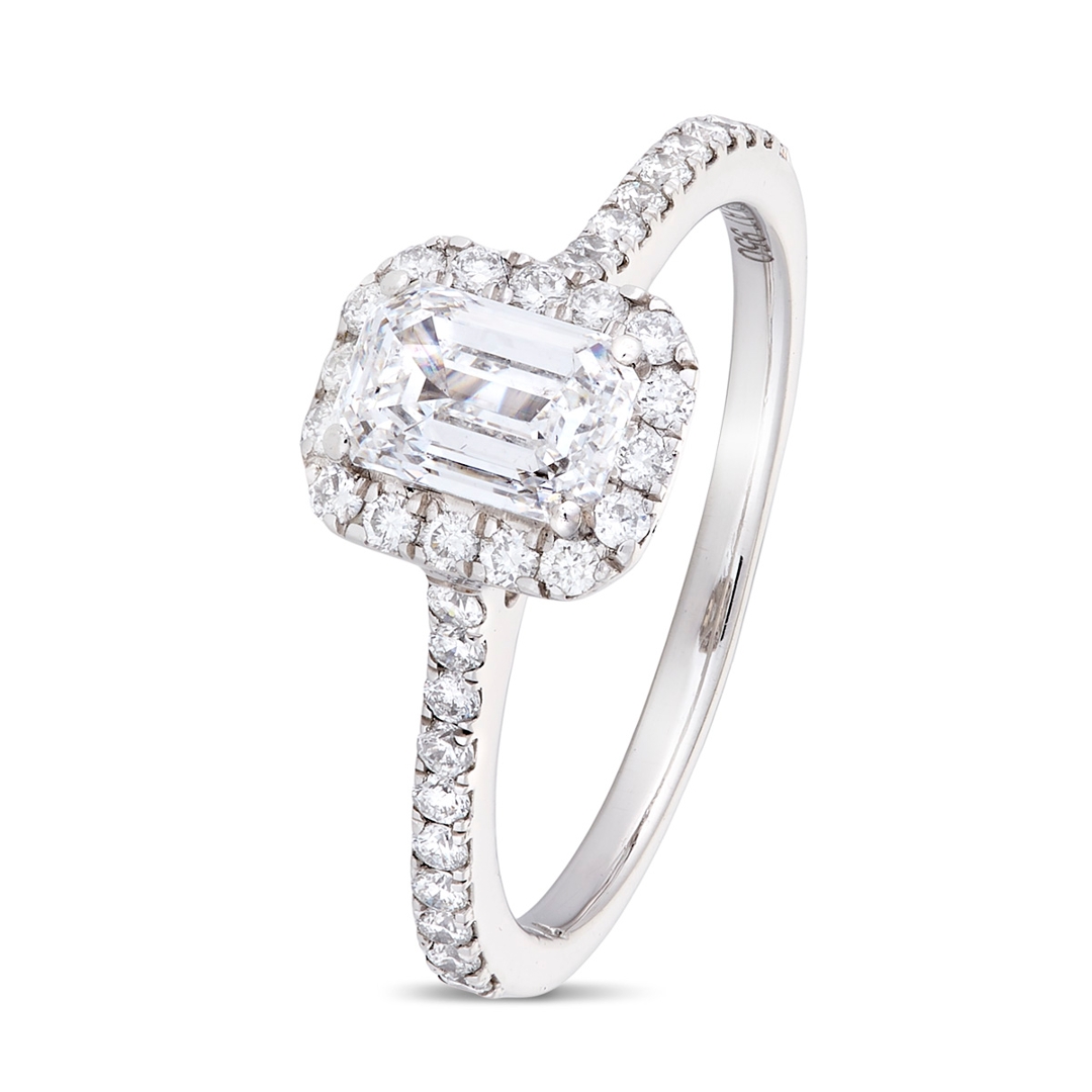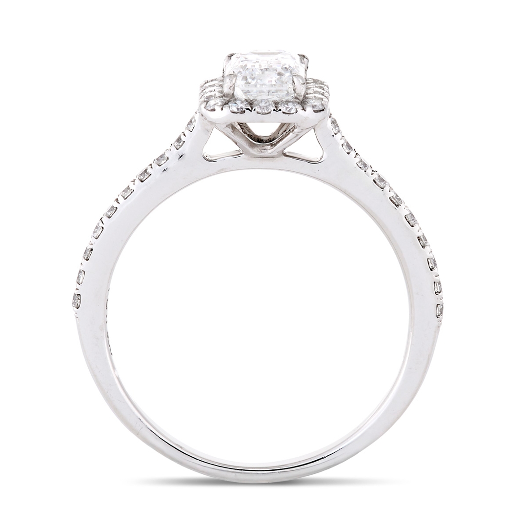 Surrounding the centre stone is a shimmering halo of brilliant-cut diamonds, designed to enhance the emerald-cut’s structured elegance and add sparkle. The brilliance continues along the shoulders, where more diamonds are meticulously set for a seamless, radiant effect. These accent stones, with a combined weight of 0.34ct, are graded F-G in colour and SI1-SI2 in clarity, offering a soft yet striking complement to the centrepiece.