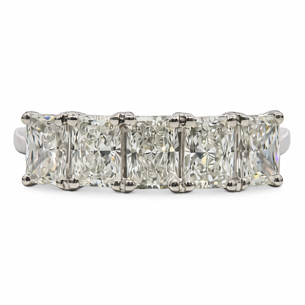 A brand-new, unused, GIA-certified natural diamond five-stone eternity ring, with five radiant-cut diamonds, set in platinum.