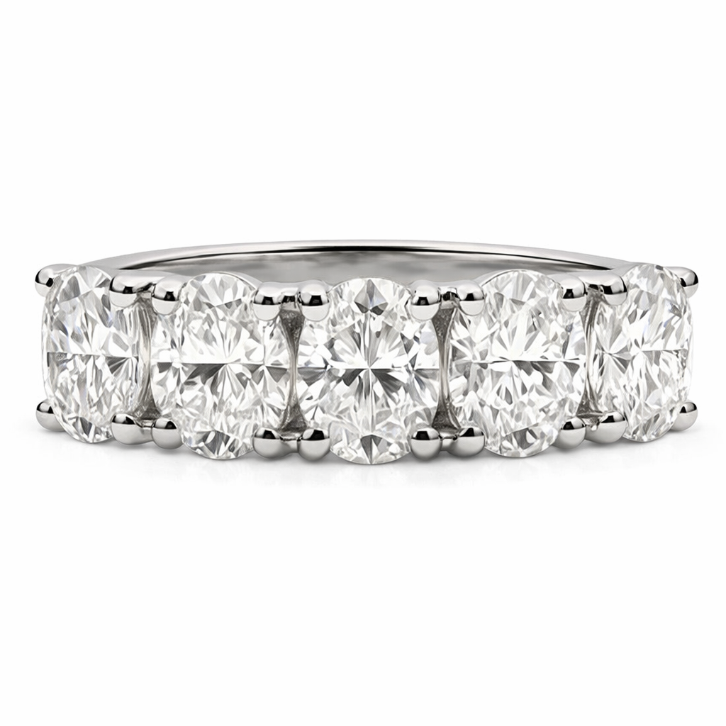 A brand-new, unused GIA-certified natural diamond five-stone eternity ring, set with five elegantly matched oval-cut diamonds totalling 2.02ct. Each diamond has been selected for its lively brilliance and balanced proportions, with the oval cut offering excellent light return while creating a graceful, elongated appearance across the finger. Graded F–G colour, the stones present a bright near-colourless tone, while SI1 clarity ensures impressive sparkle with natural characteristics that do not detract from overall beauty.