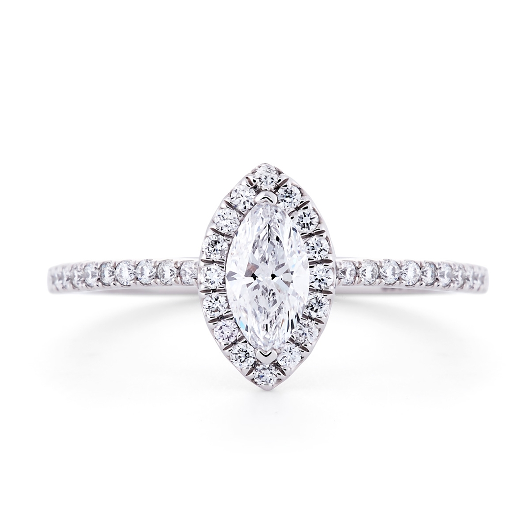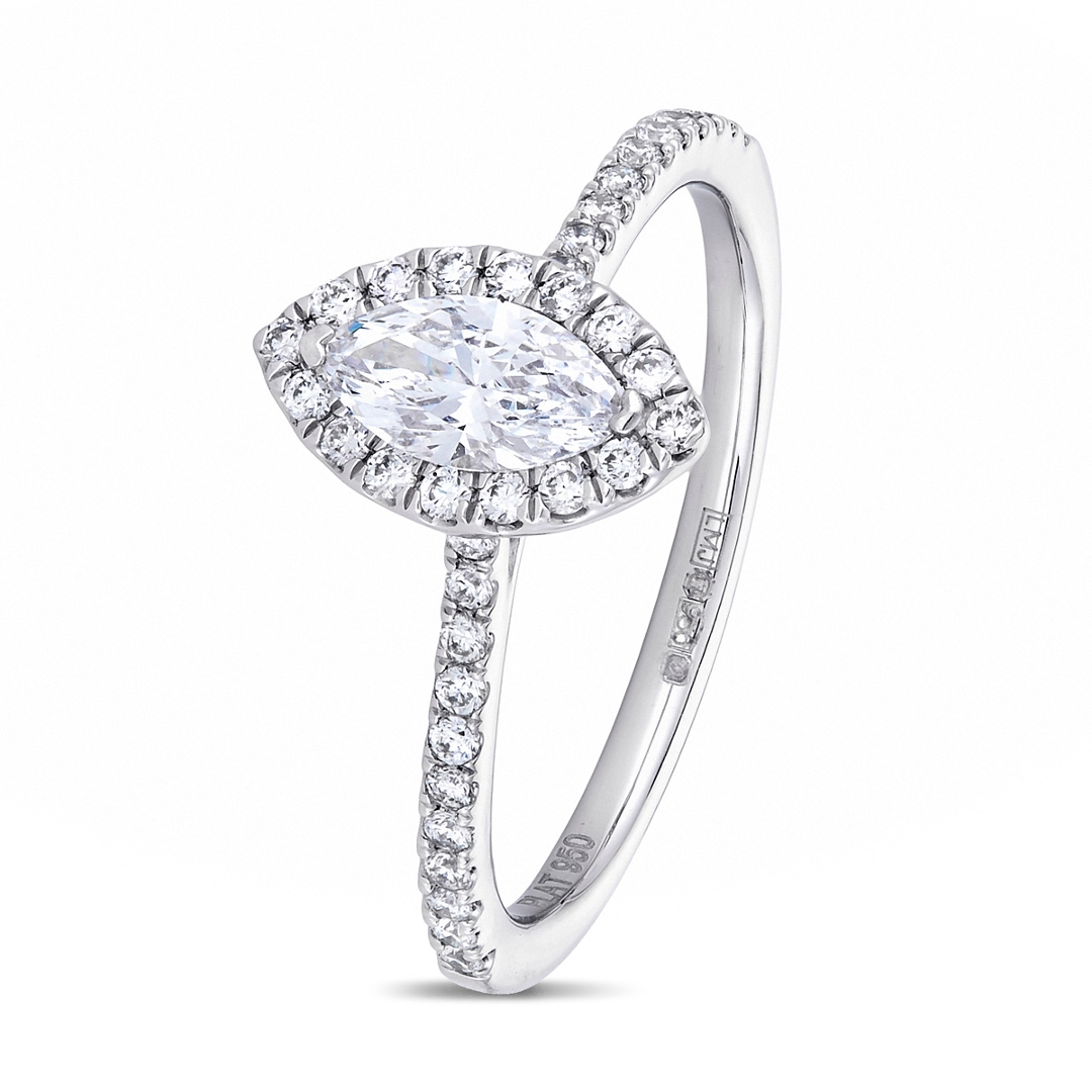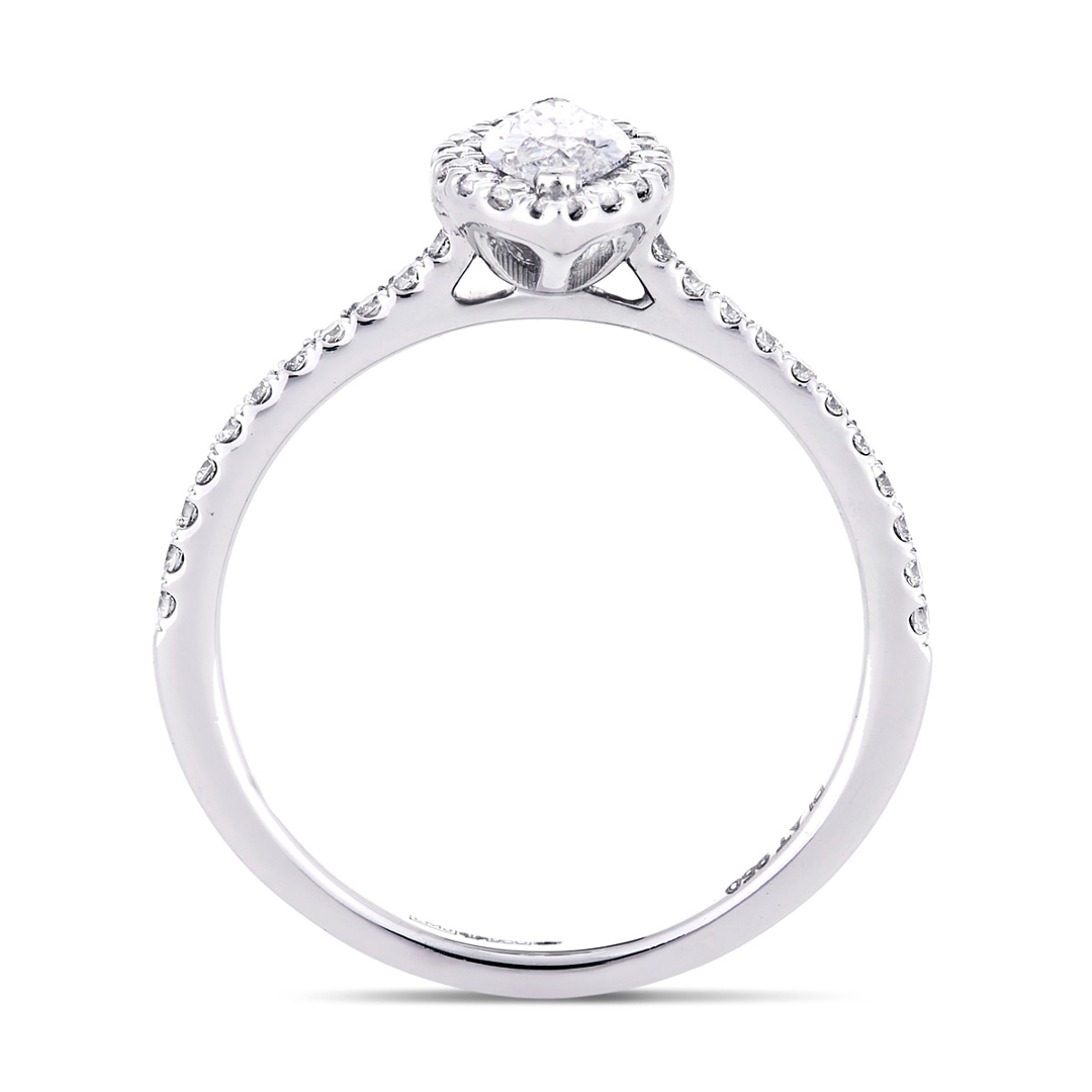 Encircling the marquise diamond is a halo of brilliant-cut diamonds, meticulously arranged to enhance its brilliance and lend a sense of grandeur. The sparkle continues along the shoulders, where additional brilliant-cut diamonds are set to create a seamless, flowing design. These accent stones, with a combined weight of 0.25ct, are graded H-I in colour and VS1-VS2 in clarity, offering refined contrast and a soft shimmer that perfectly complements the centre stone.
