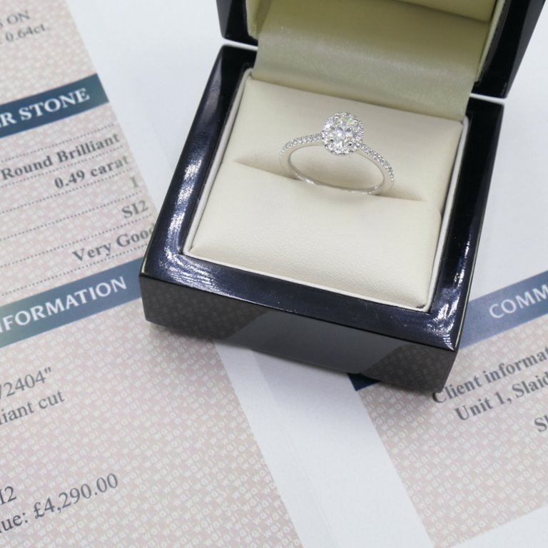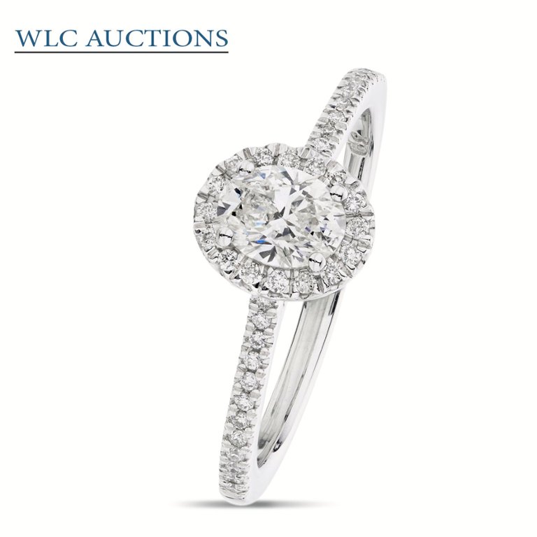 A brand new, unused, certified natural diamond solitaire engagement ring, set with one oval cut diamond to the centre & brilliant cut diamonds in a halo setting & to the shoulders, set in platinum.