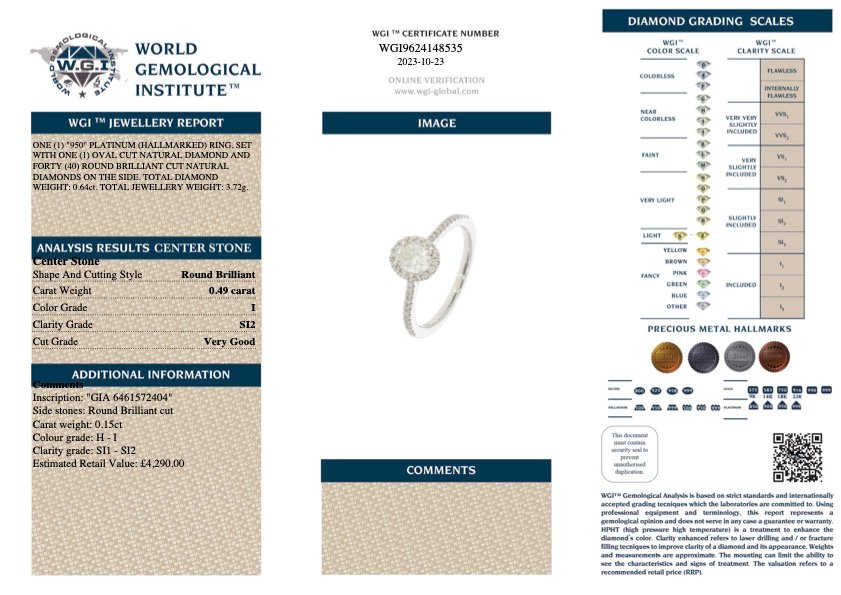 A brand new, unused, certified platinum natural diamond solitaire ring, a captivating masterpiece that exudes refined luxury. At its heart lies a mesmerising oval-cut diamond delicately set to showcase its inherent brilliance and allure. With a weight of 0.49 carats, this exquisite diamond boasts SI2 clarity, allowing light to dance effortlessly through its facets and illuminate the room with its radiant sparkle. Its enchanting colour adds a touch of warmth and depth, accentuating the diamond's natural beauty.