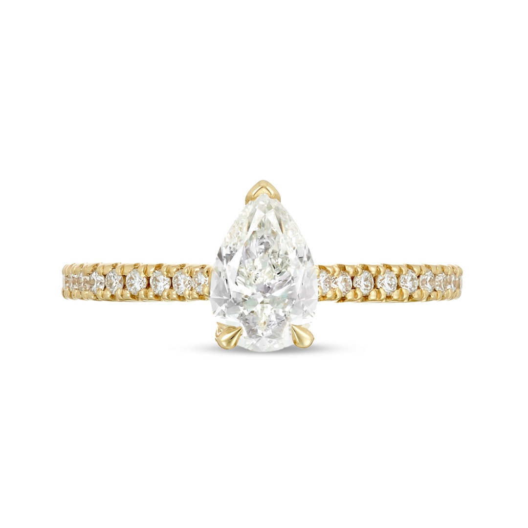 A brand-new, unused GIA-certified natural diamond solitaire engagement ring, centred around an elegant 1.01ct pear-cut diamond, complemented by a refined cluster of brilliant-cut diamonds along the shoulders, all set in 18ct yellow gold. The centre stone displays an H colour, offering a pleasing balance of warmth and brightness, while its SI2 clarity ensures a strong visual presence with lively light return. The shoulder diamonds, totalling 0.17ct, feature higher F–G colour and VS2–SI1 clarity, adding a crisp accent that enhances the overall brilliance of the piece.