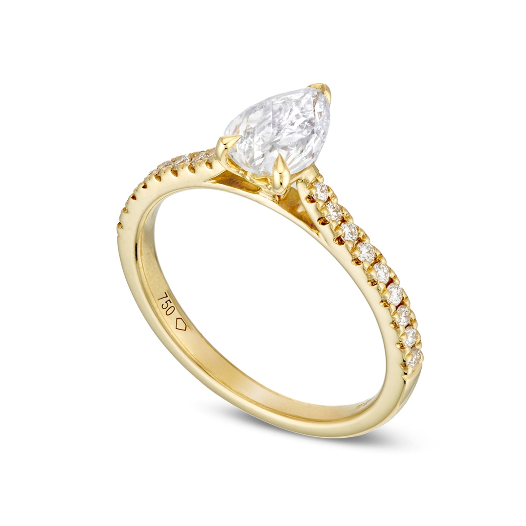 The 18ct yellow gold setting brings a classic warmth that pairs beautifully with the distinctive teardrop shape of the pear-cut diamond, creating an elegant and elongated effect on the finger. With a total weight of 2.99g, the ring is thoughtfully crafted to provide comfort and durability while maintaining a refined, timeless aesthetic suited to a wide range of styles.
