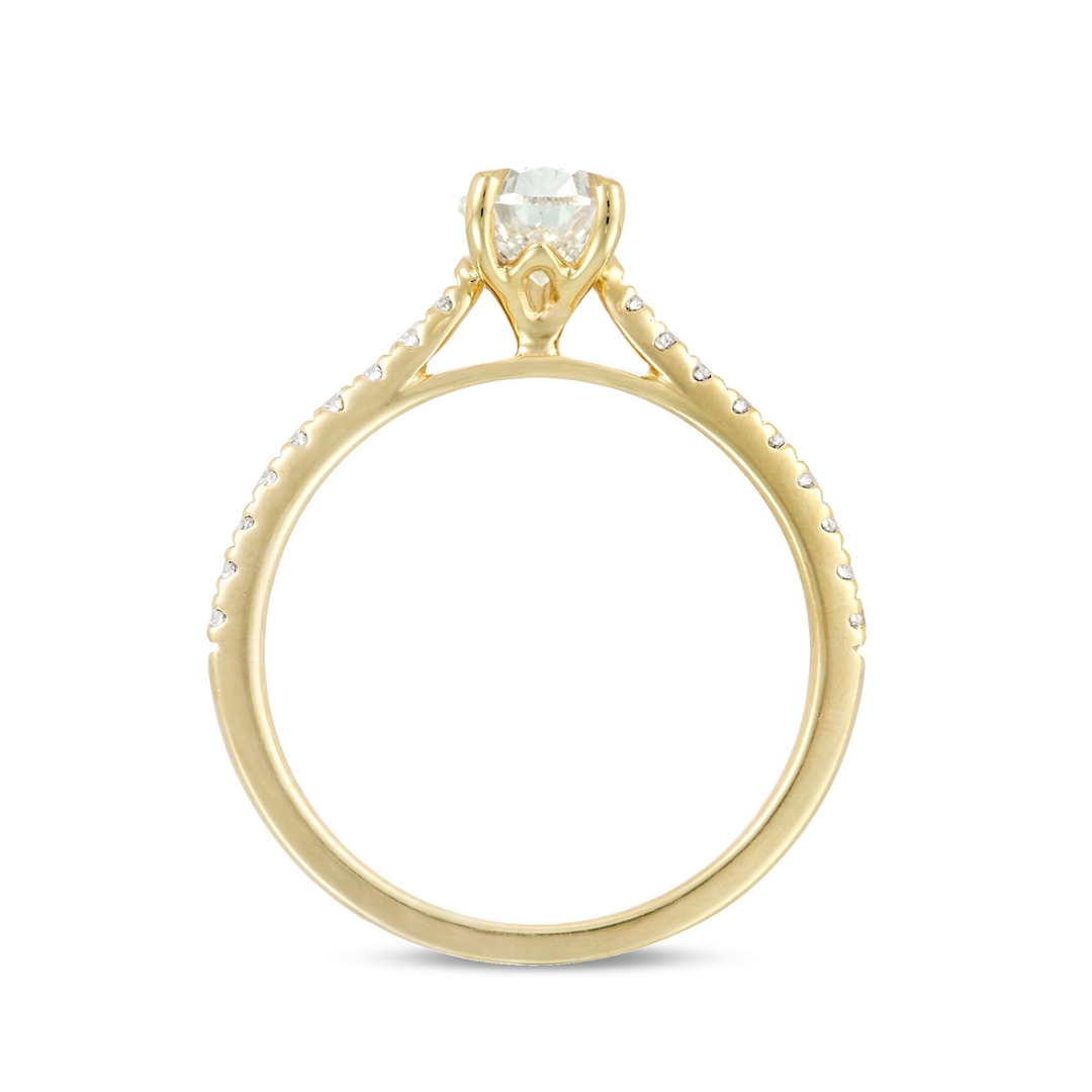 A brand-new, unused, GIA-certified natural diamond solitaire engagement ring, with one pear-cut diamond at the centre & a cluster of brilliant-cut diamonds to the shoulders, set in 18ct yellow gold.
