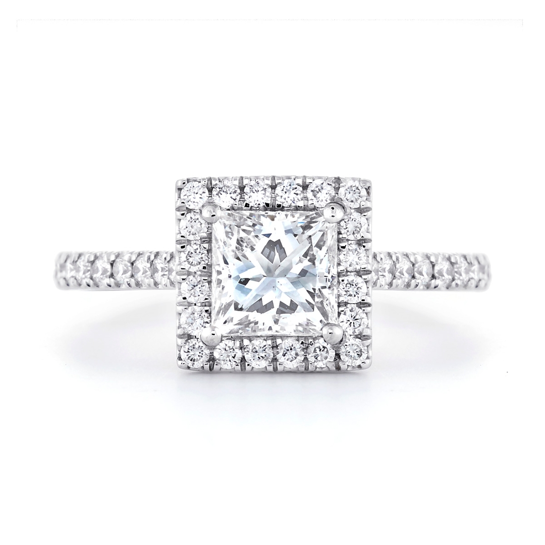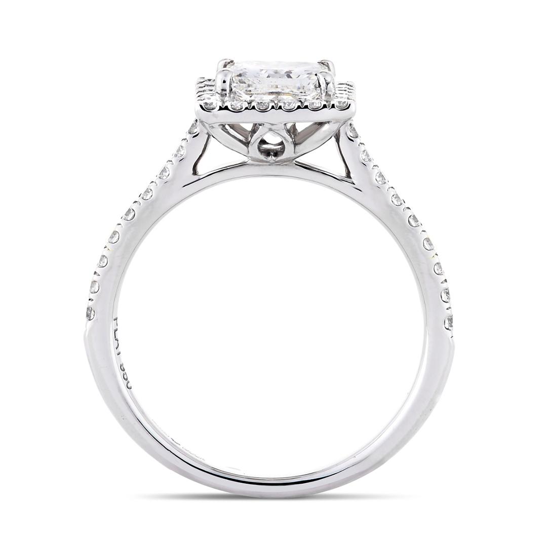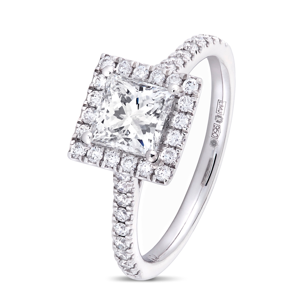 A brand-new, unused GIA-certified natural diamond solitaire engagement ring set with one princess-cut diamond at the centre & a cluster of brilliant-cut diamonds in a halo setting on the shoulders, set in platinum.