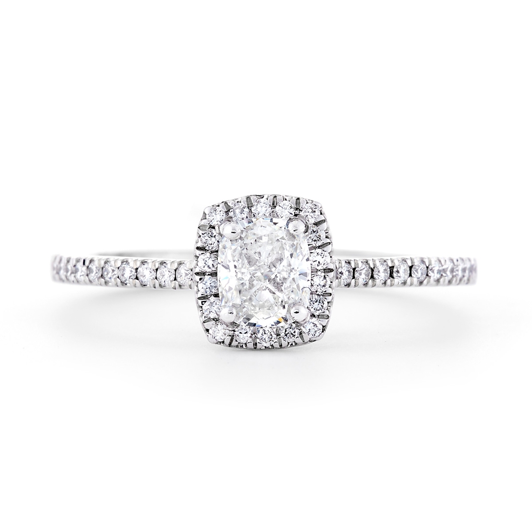 Encircling the radiant centre is a cluster of brilliant-cut diamonds in a halo setting, designed to enhance the overall sparkle and create a sense of depth and glamour. The brilliance continues along the shoulders, where additional diamonds are meticulously set to add further radiance and sophistication. These accent stones, with a combined weight of 0.18ct, are graded F-G for colour and VS2-SI1 for clarity, offering a consistent, elegant sparkle that complements the centre stone beautifully.