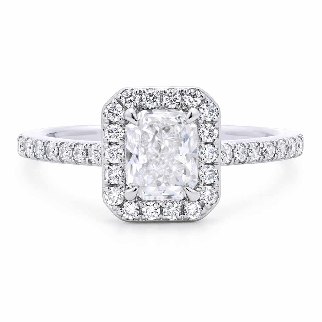 A brand-new, unused GIA-certified natural diamond solitaire engagement ring that blends bright sparkle, refined structure, and the enduring qualities of genuine diamonds. At its centre rests a 0.70ct radiant-cut natural diamond graded E in colour and SI2 in clarity, offering a crisp, near-colourless appearance with lively brilliance. The radiant cut combines the clean geometry of an emerald shape with the fire of a brilliant cut, allowing the stone to display strong flashes of light that give the ring a confident and elegant presence. Surrounding the centre diamond is a halo of natural brilliant-cut diamonds, with additional diamonds set along the shoulders, bringing the supporting diamond weight to 0.29ct. These natural diamonds add vibrant sparkle and carry a strong appreciation factor, valued for their authenticity, rarity, and long-established desirability within fine jewellery.