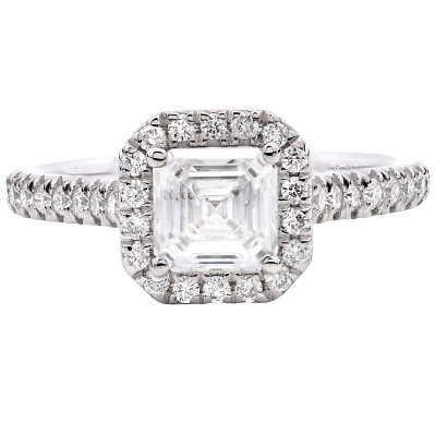 Encircling the centre stone is a delicate halo of brilliant-cut diamonds, adding extra sparkle and dimension. The shoulders are equally adorned, creating a seamless flow of light that draws the eye from every angle. These additional diamonds total 0.31ct, enhancing the ring’s luminosity without overshadowing the centrepiece.