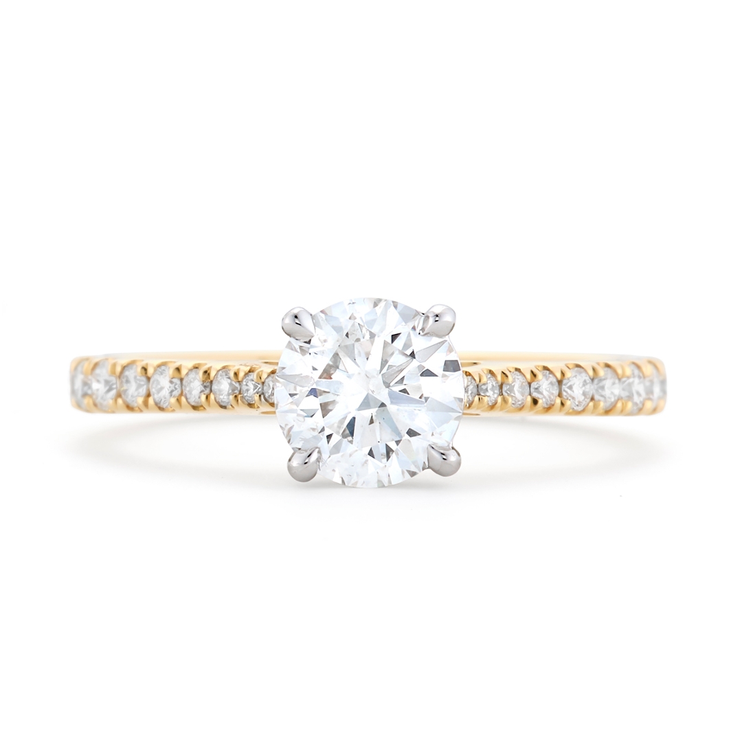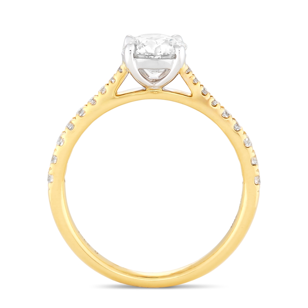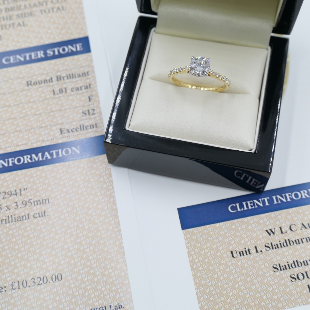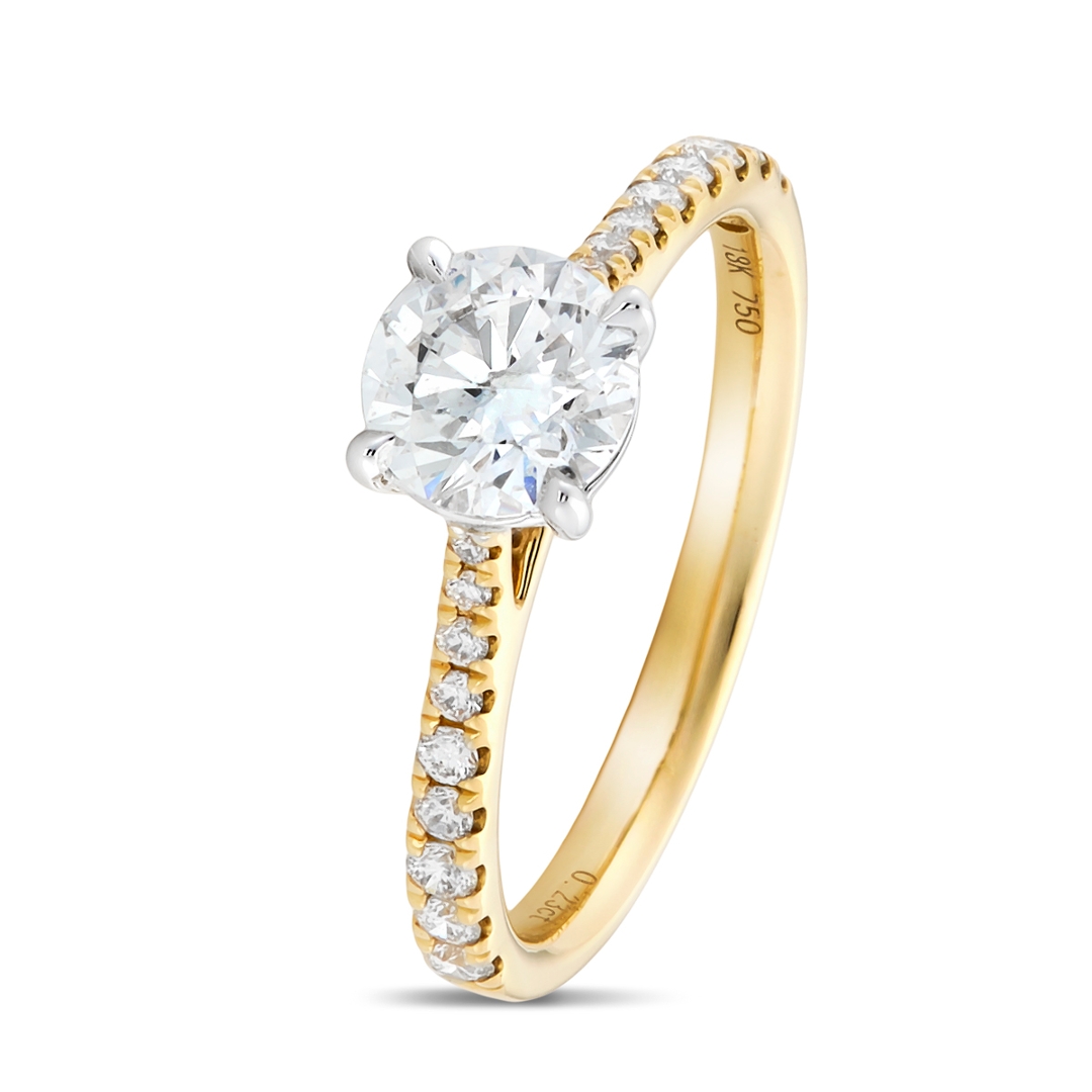 A brand-new, unused GIA-certified 18ct yellow and white gold solitaire engagement ring, crafted with refinement to highlight the brilliance of natural diamonds. At its centre rests a 1.01-carat brilliant-cut diamond, graded SI2 clarity and an exceptional F colour, displaying crisp brightness and an elegant sparkle. The shoulders are set with a cluster of additional brilliant-cut diamonds, totalling 0.23 carats, graded SI1 clarity and F–G colour, enhancing the centre stone with added radiance and depth and weighing 3.15 grams. The mix of white and yellow gold provides both contrast and warmth, resulting in a timeless yet distinctive design.