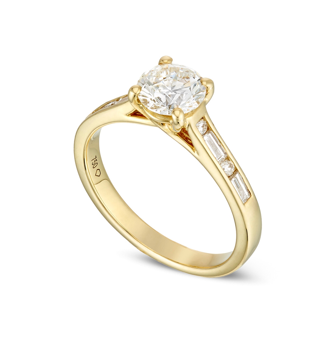 A brand-new, unused GIA-certified natural diamond solitaire engagement ring, centred around a beautifully proportioned 1.00ct brilliant-cut diamond, enhanced by a sophisticated arrangement of baguette-cut and brilliant-cut diamonds along the shoulders, all set in 18ct yellow gold. The centre stone displays an impressive F colour, offering a bright, colourless appearance, while its SI2 clarity delivers a pleasing balance of visual performance and value. The shoulder diamonds, totalling 0.24ct, are of higher F–G colour and VS1–VS2 clarity, introducing a refined contrast and elevating the overall brilliance of the design.