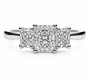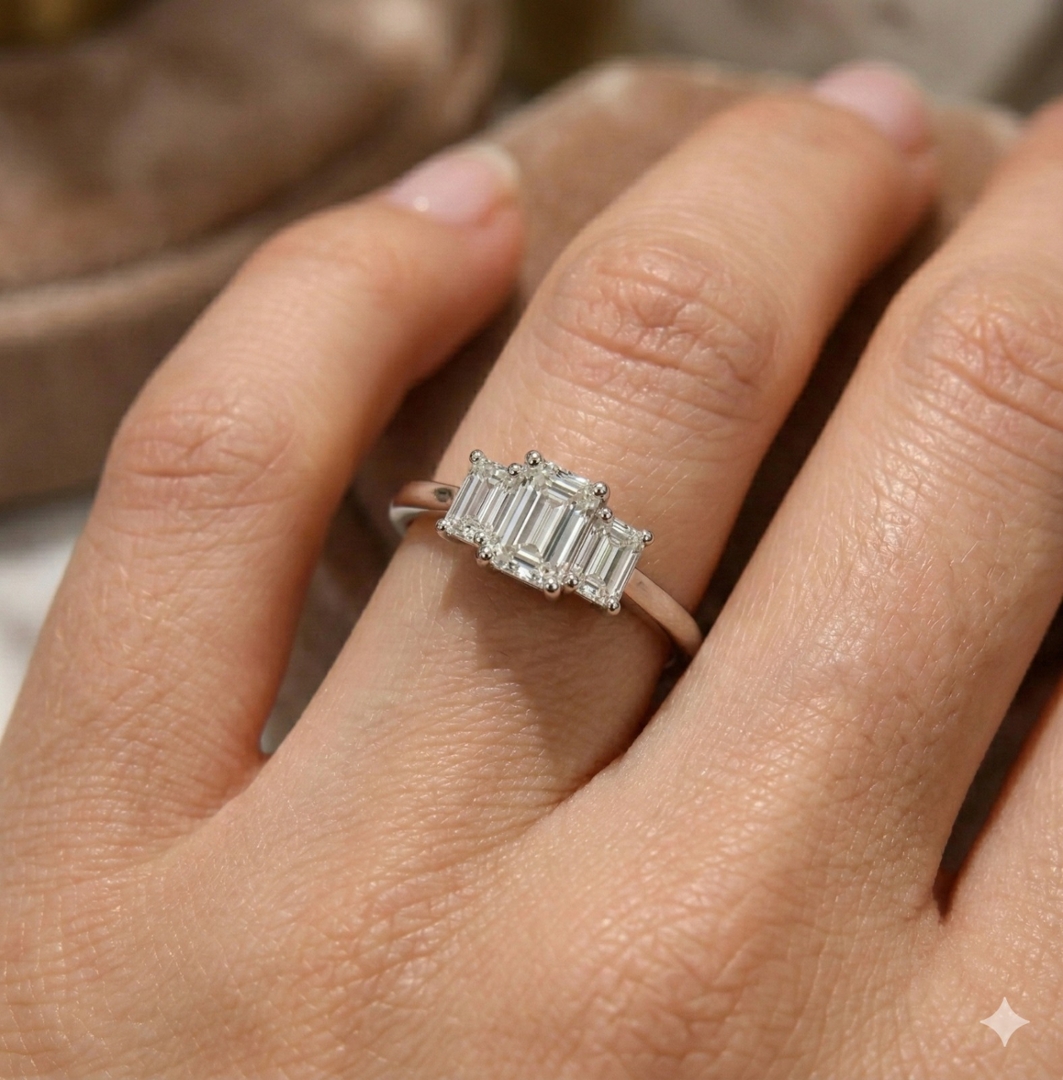 Crafted in platinum, the setting provides enduring strength and a naturally bright tone that enhances the diamonds’ superior colour grade. The clean geometry of the emerald cuts delivers understated sophistication, while the three-stone arrangement offers timeless symbolism and elegant finger coverage without excess.