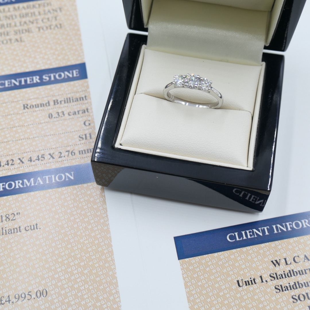 A brand-new, unused certified natural diamond three-stone eternity ring, expertly crafted in platinum. This elegant design features three brilliant-cut natural diamonds, totalling 0.66 carats, symbolising the past, present, and future in perfect harmony. The centre diamond, weighing 0.33 carats with G colour and SI1 clarity, radiates exceptional brightness, while the two side diamonds, together weighing 0.33 carats with G-H colour and SI1–SI2 clarity, enhance the ring’s brilliance with their balanced sparkle. The sleek platinum setting highlights the purity of each diamond, creating a timeless piece that exudes both sophistication and sentimental value.